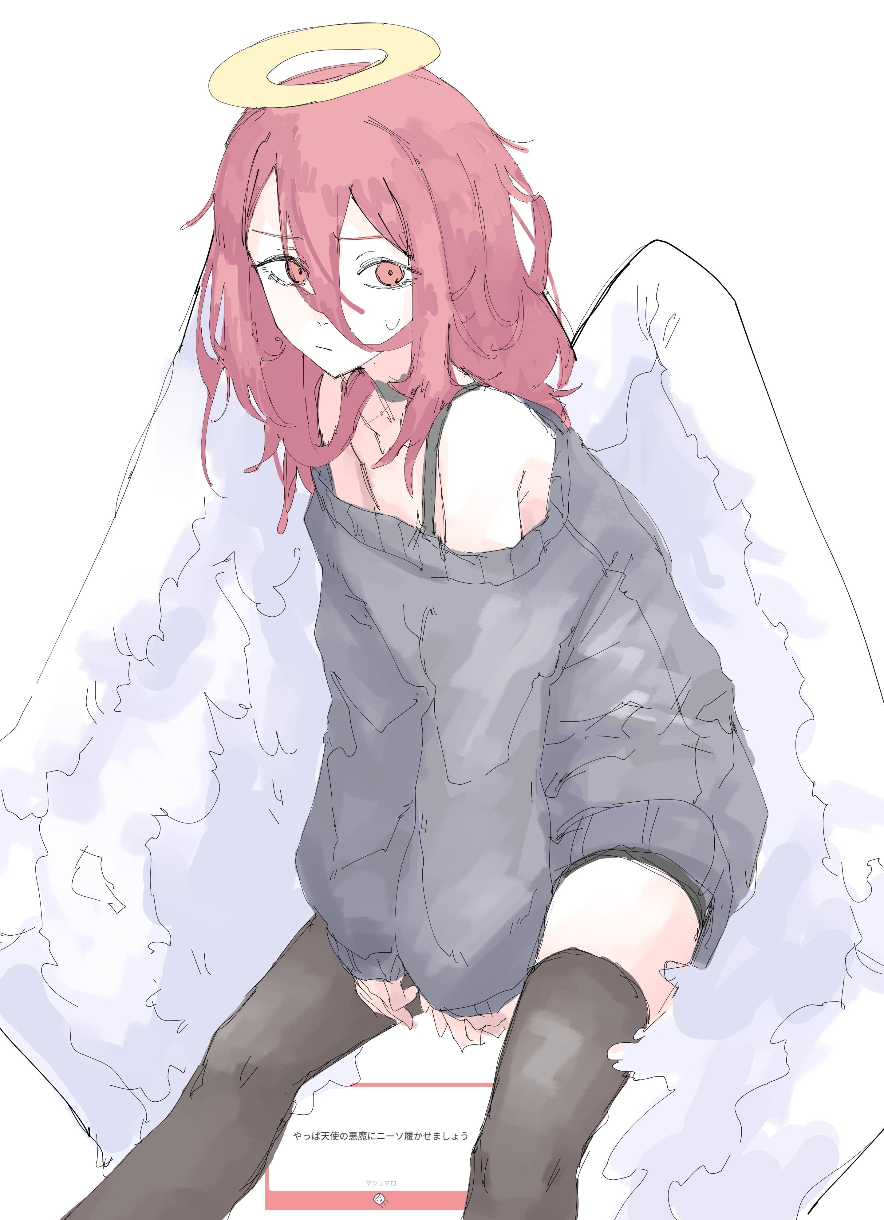 1boyandrogynousangel wingsarms between legsblack chokerblack shortsblack thighhighschokerclosed mouthfeet out of framegrey sweaterhaloinvisible chairmale focusmarshmallow (site)medium hairoff shoulderoff-shoulder sweaterred eyesred hairrequest insetshortssimple backgroundsittingsolospaghetti strapsweatdropsweaterthighhighstraditional halowhite backgroundwhite wingswings