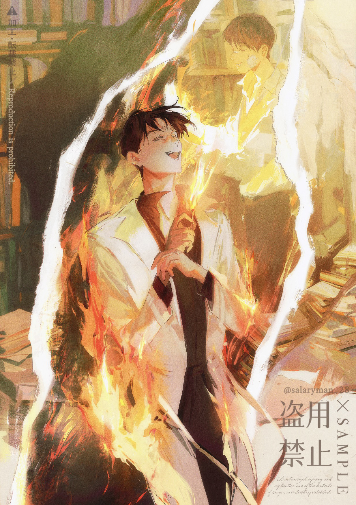 1other2boysblack hairblack shirtbookshelfburningcoatcowboy shotdual personafirehand on own wristholding matchsticklaughinglibrarymultiple boysoldest dreamopen mouthout of framerevealing layershirtshort hairsmoketorn paperwhite coat