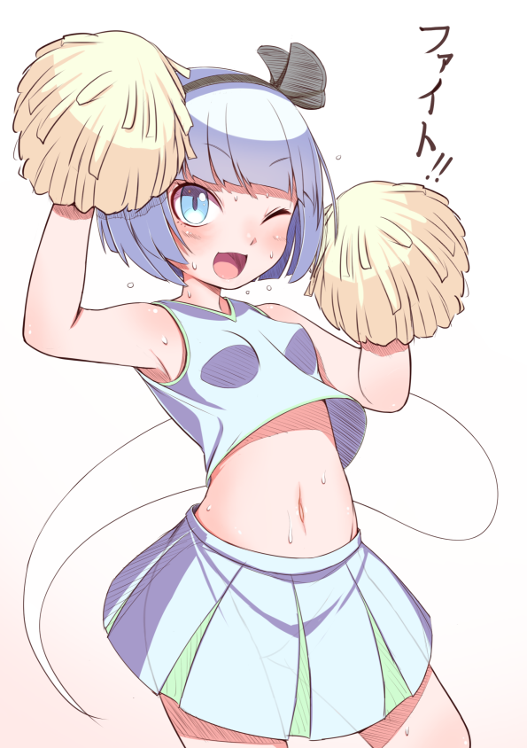 buriki, kawashiro nitori, kitashirakawa chiyuri, mimi-chan, phantasmagoria of dim.dream, touhou, touhou (pc-98), 2girls, anchor, antenna hair, blonde hair, blue eyes, blue hair, blush, cloud, fang, female focus, flats, hair bobbles, hair ornament, hat, letterboxed, long sleeves, multiple girls, one eye closed, open mouth, rocket, sailor hat, school uniform, serafuku, short sleeves, skirt, sky, socks, twintails, two side up, unworn hat, unworn headwear, white socks, yellow eyes
