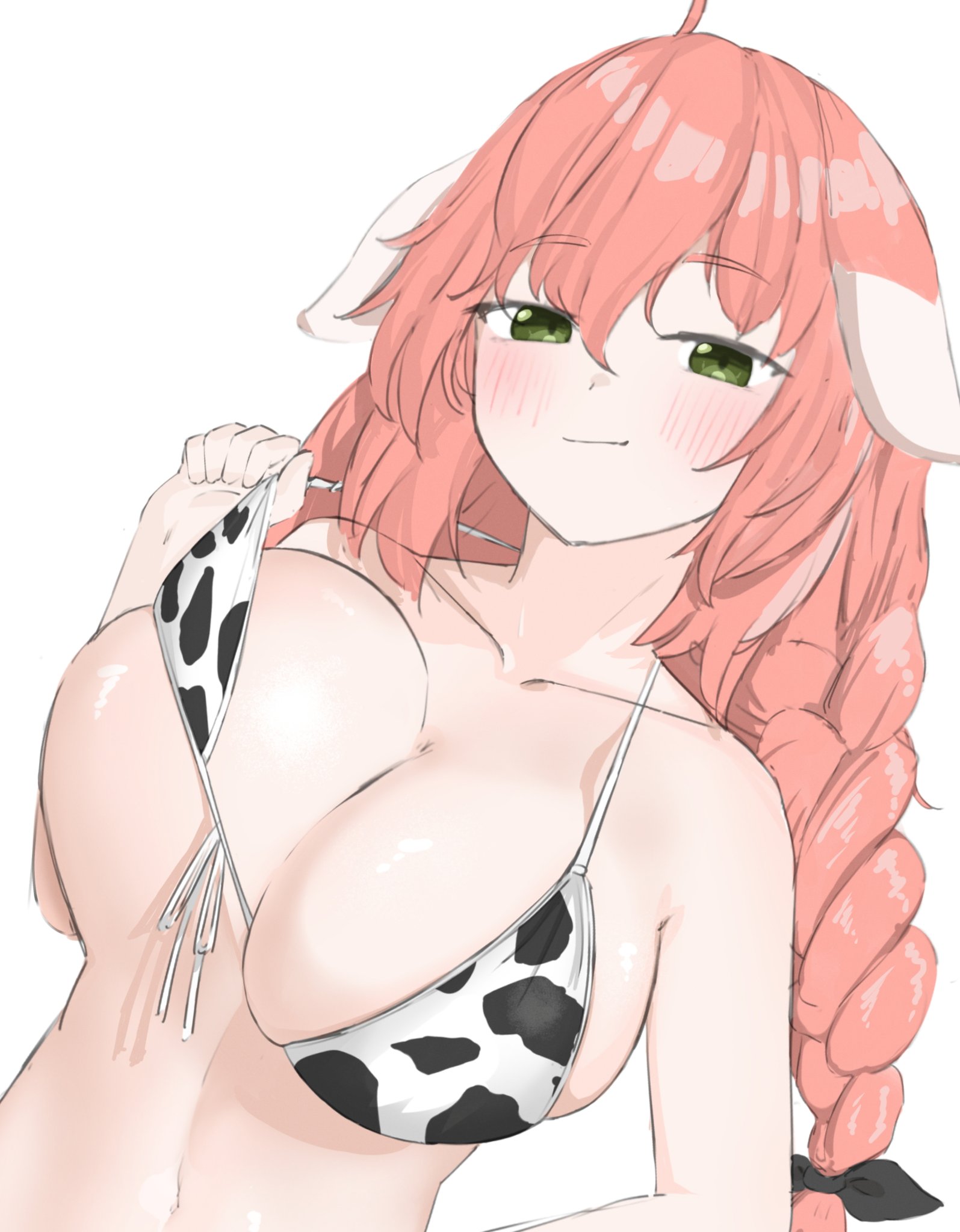chobonu, citlali (genshin impact), genshin impact, highres, 1girl, :q, animal ears, blue eyes, blush, bow, bowtie, breasts, closed mouth, double-parted bangs, facial mark, forehead mark, leotard, long hair, looking at viewer, medium breasts, multicolored hair, pink hair, playboy bunny, purple hair, rabbit ears, red bow, red bowtie, red leotard, smile, solo, tongue, tongue out, triangle, triangle facial mark, very long hair, white background