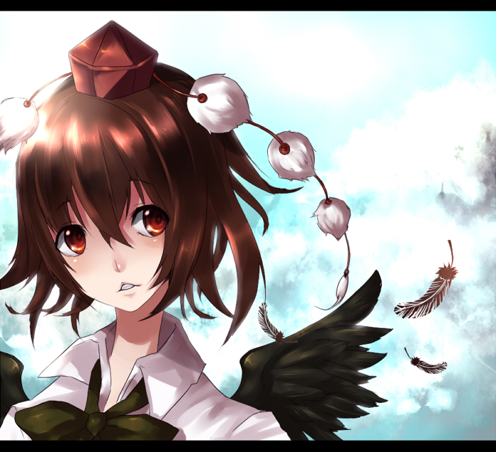 1girlblack wingsblushexpressionlessfeathersfemale focushatletterboxedparted lipsshort hairsolotokin hatwings