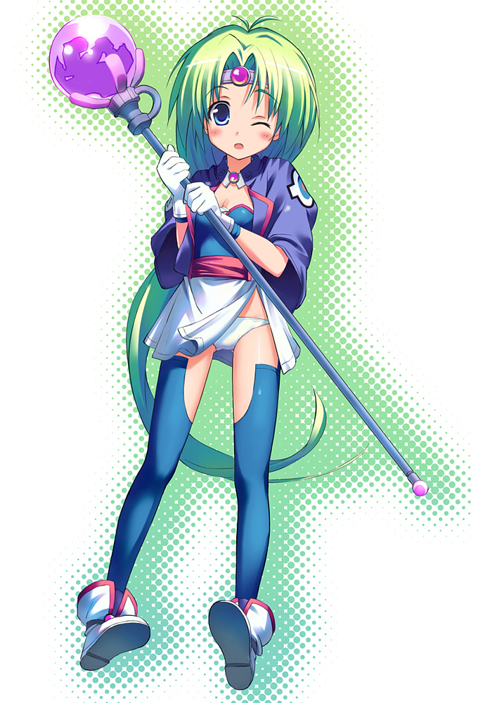 1990s (style)aqua eyescircletgreen hairlong hairpantiesshoesstaffthighhighsunderwearvery long hairwink