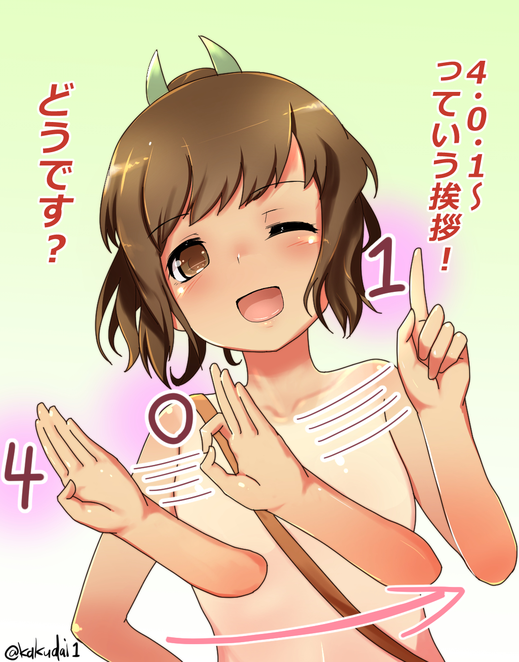 1girlsbare shouldersblushbreastsbrown eyesbrown haircollarboneconvenient censoringdirectional arrowfemaleFlag for Deletionhand on hiphumanlooking at viewermotion linesnipplesnudenumberone eye closedopen mouthponytailsmall breastssolotan linestied hairtoplessupper body