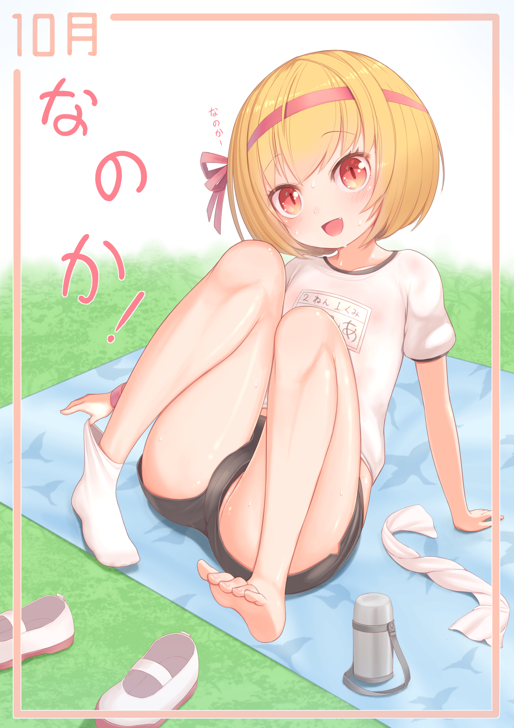 :d1girlalternate costumebarefootblack shortsblanketblonde hairblushcrotch seamfangfull bodygym uniformheadbandlooking at viewerno pantiesopen mouthorange eyespartially visible vulvapuffy short sleevespuffy sleevesred headbandshirtshoesshort hairshort shortsshort sleevesshortssittingsmilesolothermosunworn shoeswetwet clotheswhite shirtwhite shoes