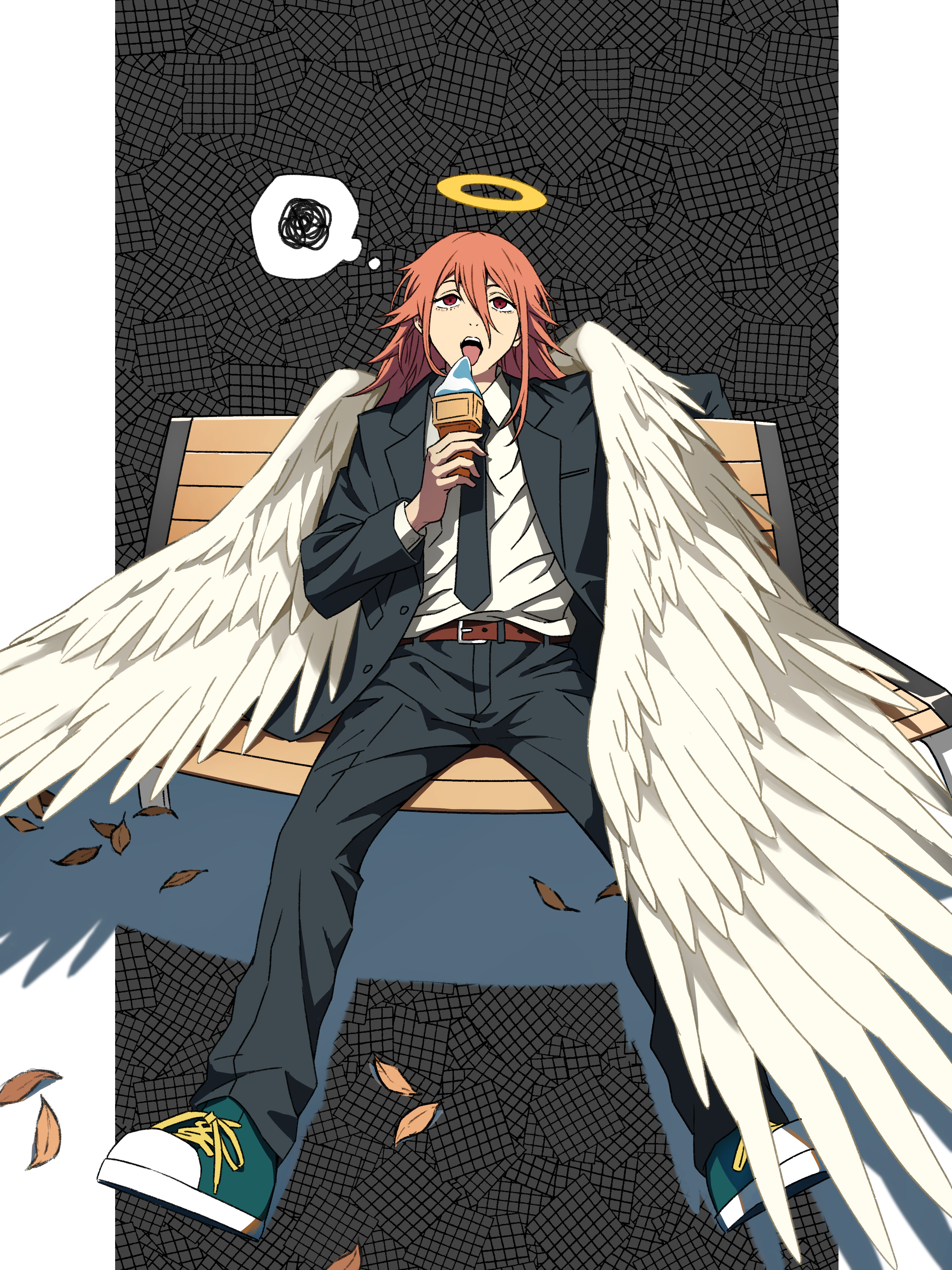 1boyangel wingsblack jacketblack pantsblack suitfeathered wingsfoodformal clotheshair between eyeshaloholdingholding ice cream coneice creamice cream conejacketleaflong hairmale focusnecktieon benchpant suitpantsred eyesred hairshirtsittingsolospeech bubblesquigglesuitsuit jacketthought bubbletonguetongue outwhite shirtwhite wingswingsyellow halo