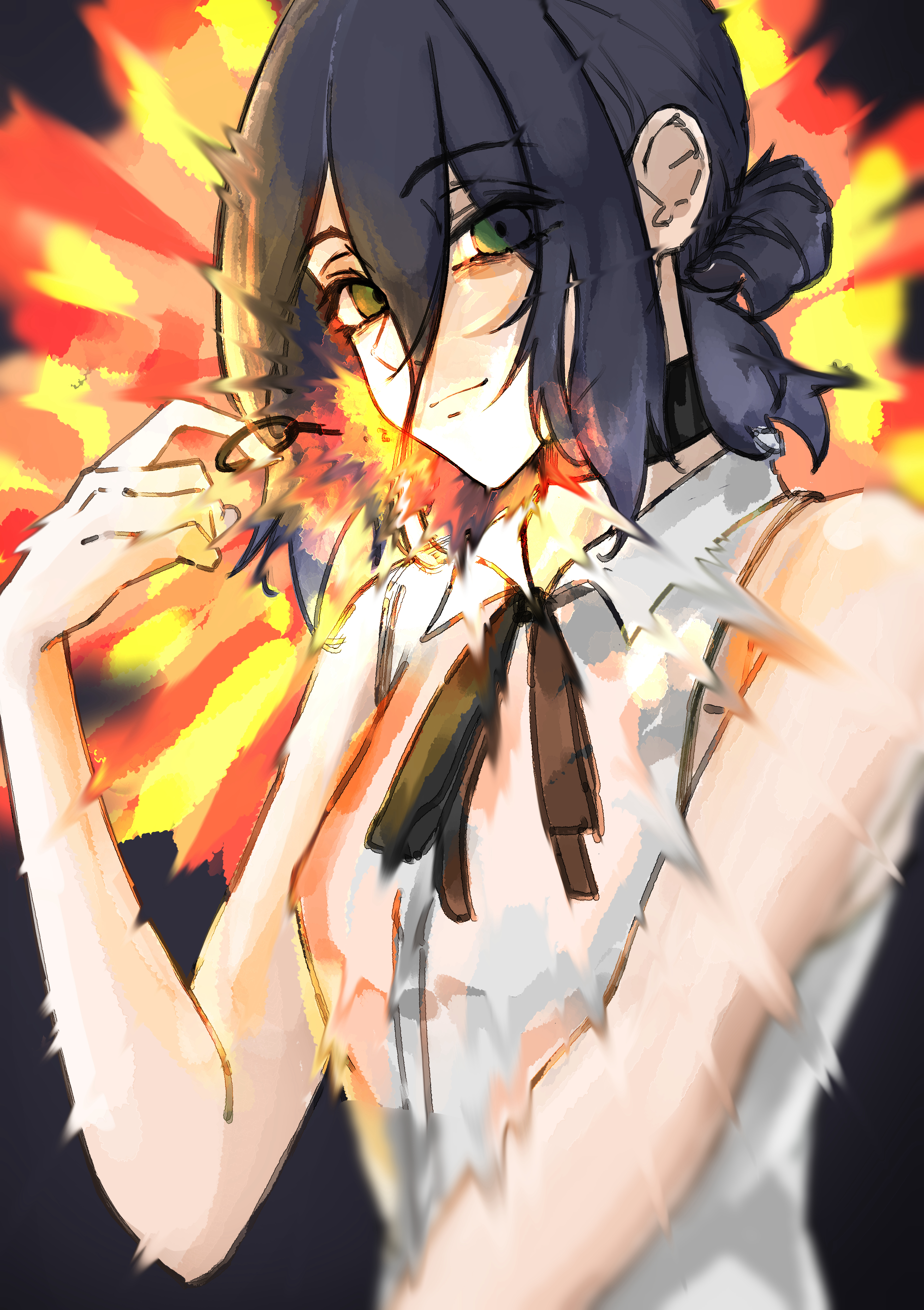 1girlblack chokerblack hairblack ribbonchokerclosed mouthcollared shirtexplosionexplosion backgroundgreen eyesgrenade pinhair between eyeshair bunneck ribbonribbonshirtsleevelesssleeveless shirtsolowhite shirt