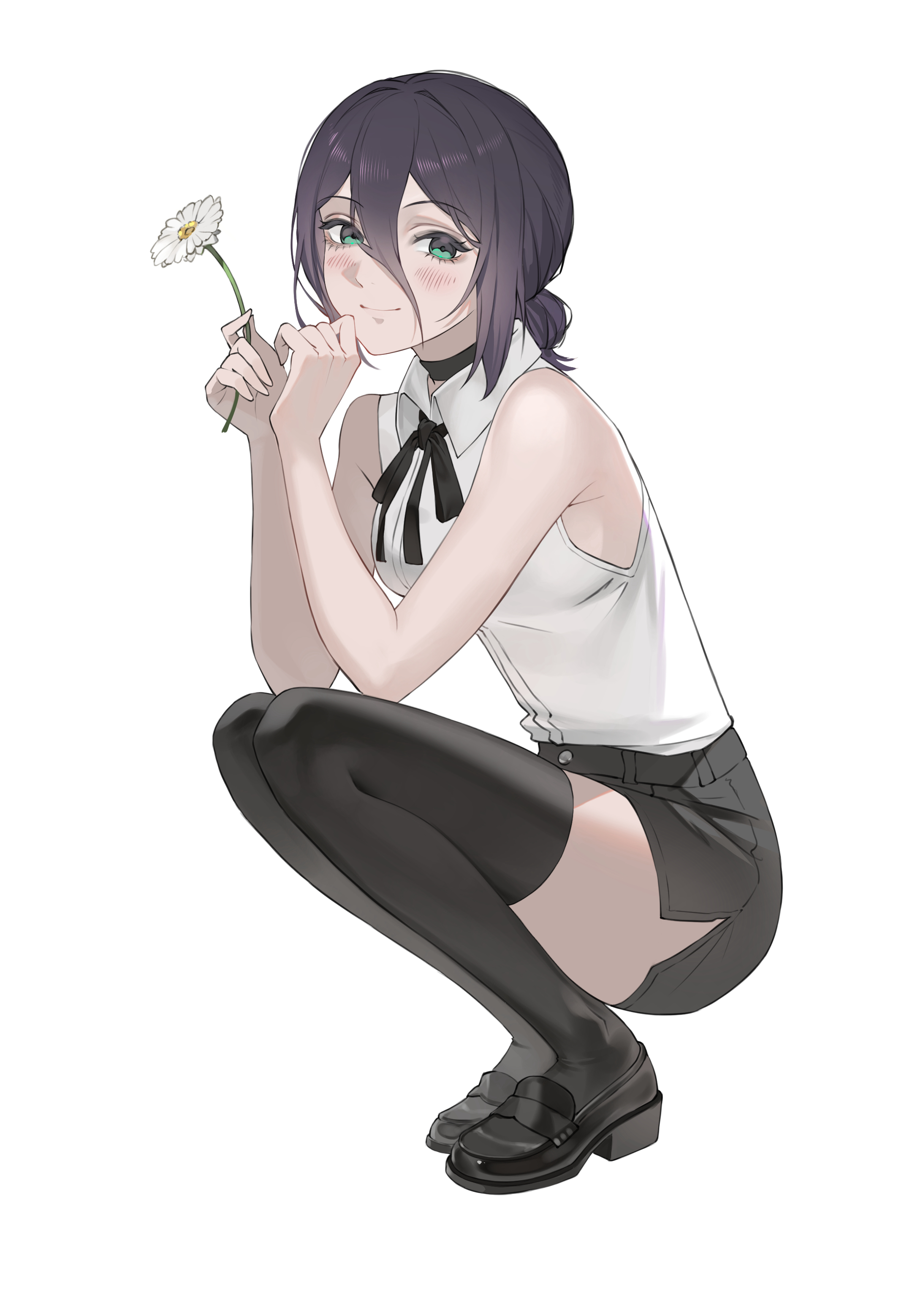 1girlblack ribbonblack shoesblack shortsblack thighhighsclosed mouthcollared shirtflowergreen eyeshair between eyesholdingholding flowerlight smileloafersneck ribbonpurple hairribbonshirtshoesshort shortsshortssimple backgroundsleevelesssleeveless shirtsolosquattingthighhighswhite backgroundwhite flowerwhite shirt