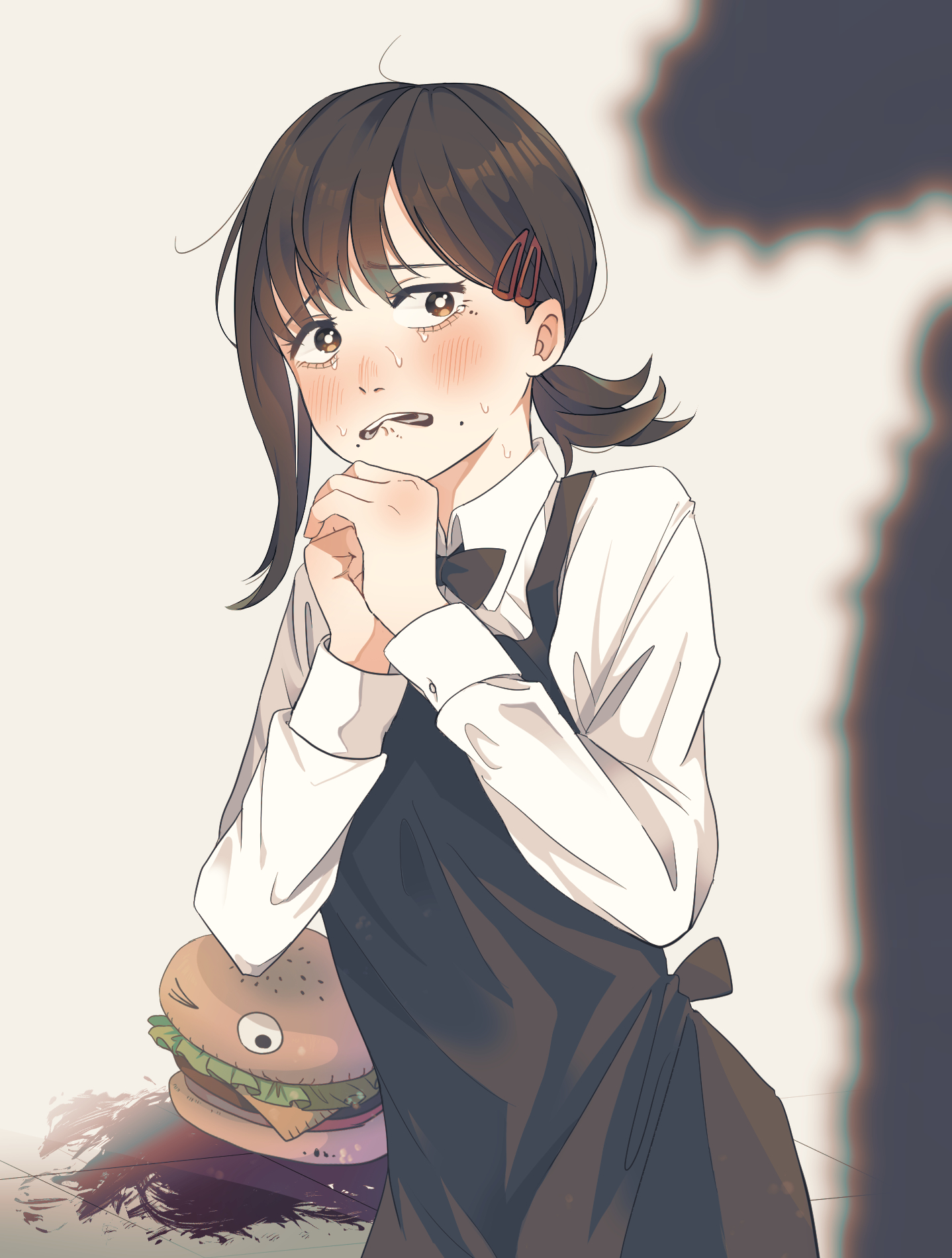 1boy1girlapronblack apronblack bowblack bowtieblack hairbloodblushbowbowtiebrown eyeshair ornamenthairclipmascot headmolemole under eyemultiple molesnervous sweatingponytailrika (tan0002)short ponytailsilhouettesingle sidelocksweat