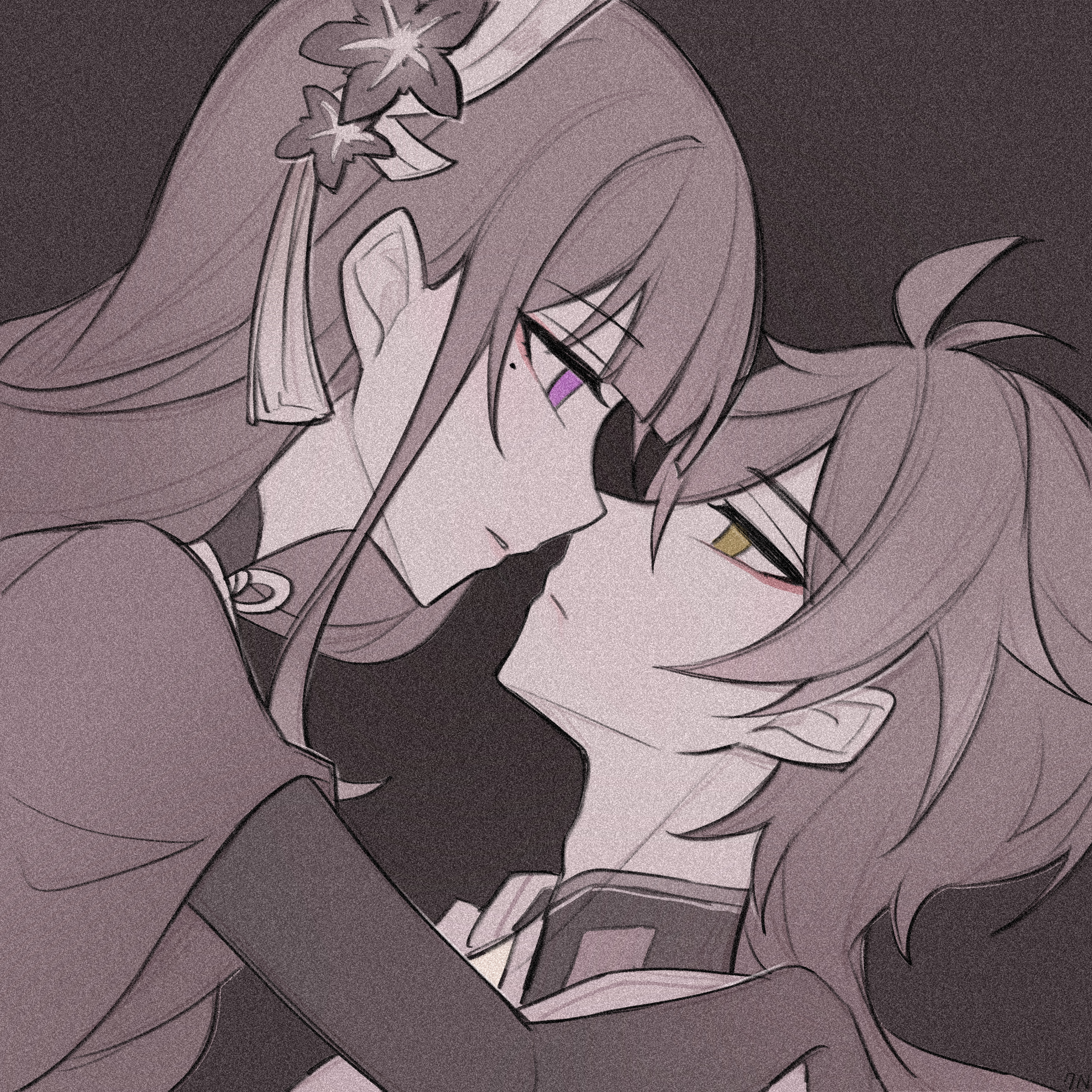 1boy1girlantenna hairblunt bangsbridal gauntletschinese clothesclosed mouthcoupleeyelinerflower ornamentfrom sidehair between eyeshair ornamenthair ringsheteroincoming kissjapanese clothesleaning backleaning forwardleaning on personlong hairlooking at anotherlooking downmakeupmolemole under eyemonochromeneck ribbonorange eyesparted lipspartially coloredpink lipspurple eyesred eyelinerribbonshort sleevessimple backgroundupper body