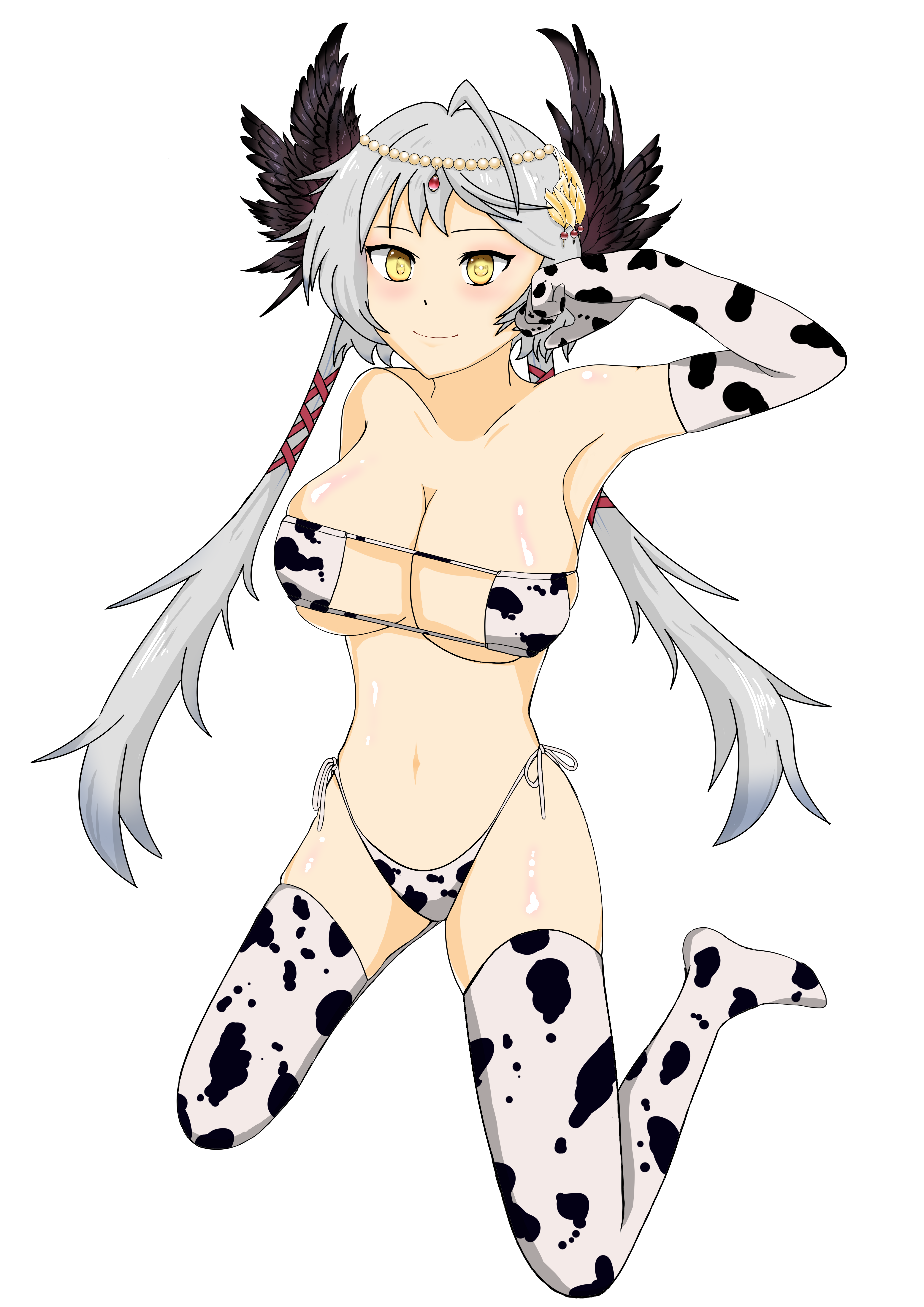 1girlahogebreastsclosed mouthcollarboneelbow glovesfull bodygloveshair ornamenthand uphead wingskneelinglarge breastslong hairmachine kerosmilesolothighhighswings