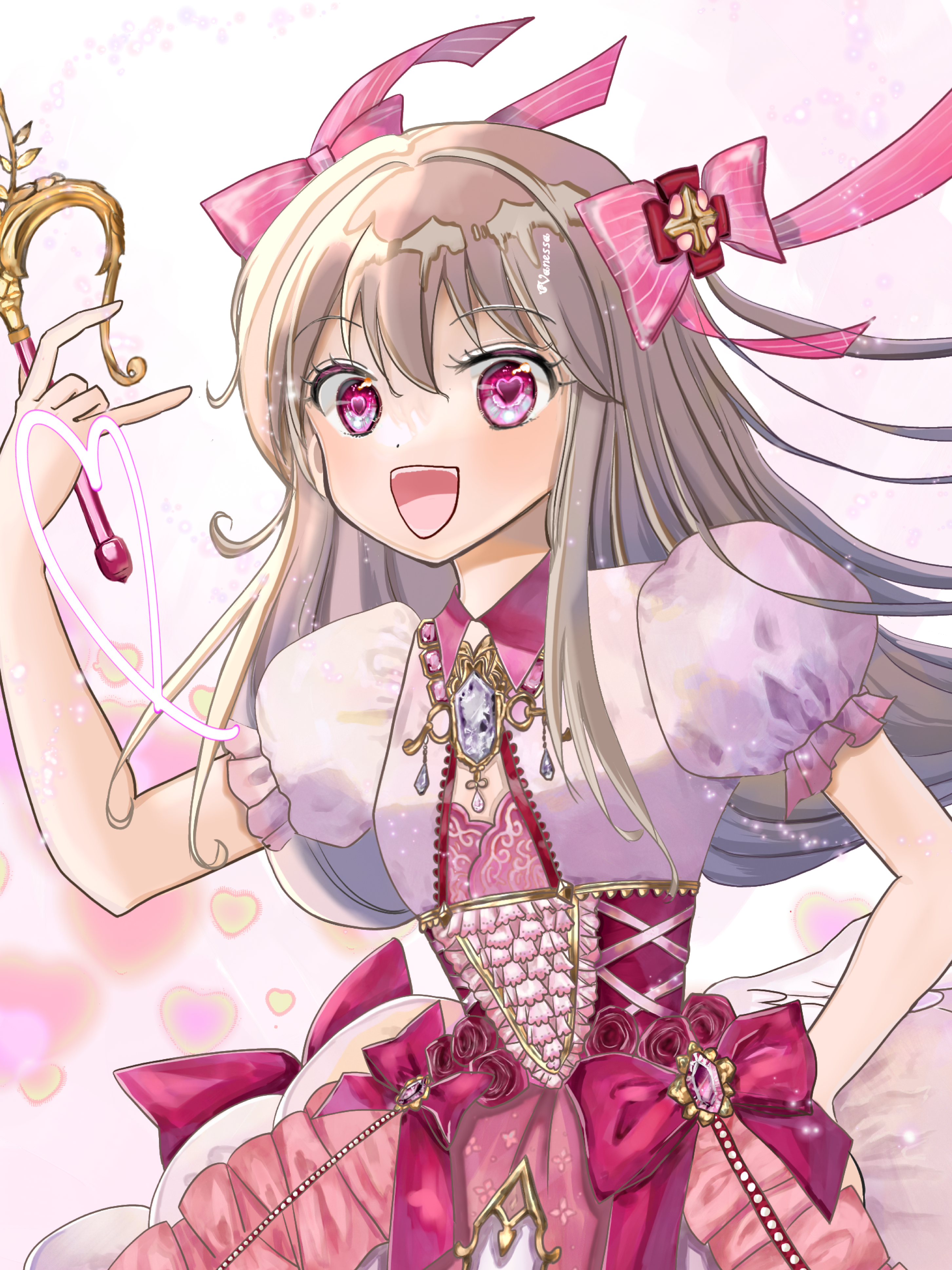 1girlblonde hairhair ribbonhand upheartheart-shaped pupilsholdingholding wandlong hairlooking at vieweropen mouthpink eyespuffy short sleevespuffy sleevesribbonshort sleevessmilesymbol-shaped pupilsva ne ssawand