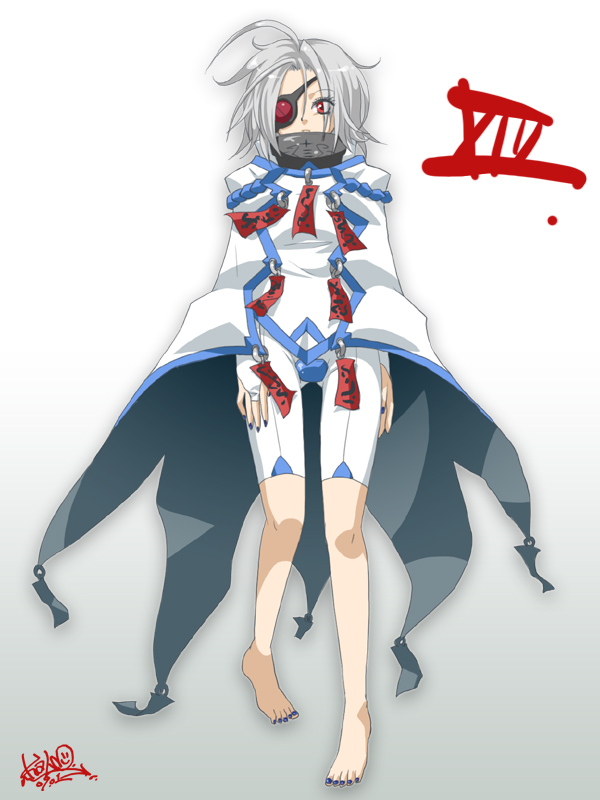 1girlahogebarefootblue nailscapeeyepatchfeetfemale focusfull bodynail polishred eyesshortssignaturesimple backgroundsolostandingwhite hair