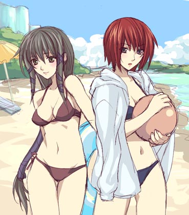 2girlsballbare armsbeachbeachballbikiniblue skyblushbrabreastscleavageclosed mouthclouddayfacing viewergrey hairhair between eyeshands uphappyholdingholding ballholding beachballholding swim ringinnertubejacketlong hairlooking at viewermedium breastsmidriffmultiple girlsnavelopen clothesoutdoorspantiesparasolparted lipsred hairsandshort hairskysmilestandingswim ringswimsuitumbrellaunderwearwater