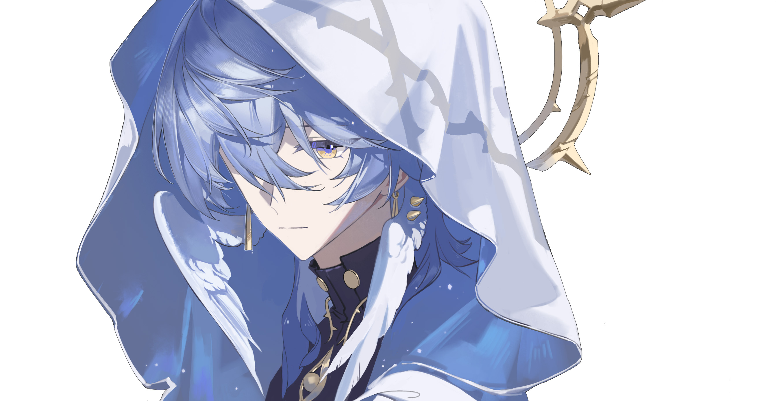1boyearringsexpressionlesshair over one eyehalohalo behind headhead wingshoodhood upjewelrylight particleslooking downmale focusone eye coveredportraitprint hoodshort hairsimple backgroundsoloturtleneckwhite backgroundwhite hairwingsyellow eyes