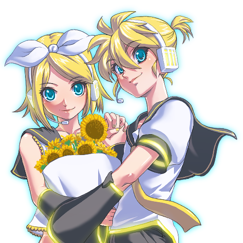 1boy1girlaqua eyesblonde hairbrother and sisterdetached sleevesflowerglowinghair ribbonheadphonesribbonsiblingssunflowertwins