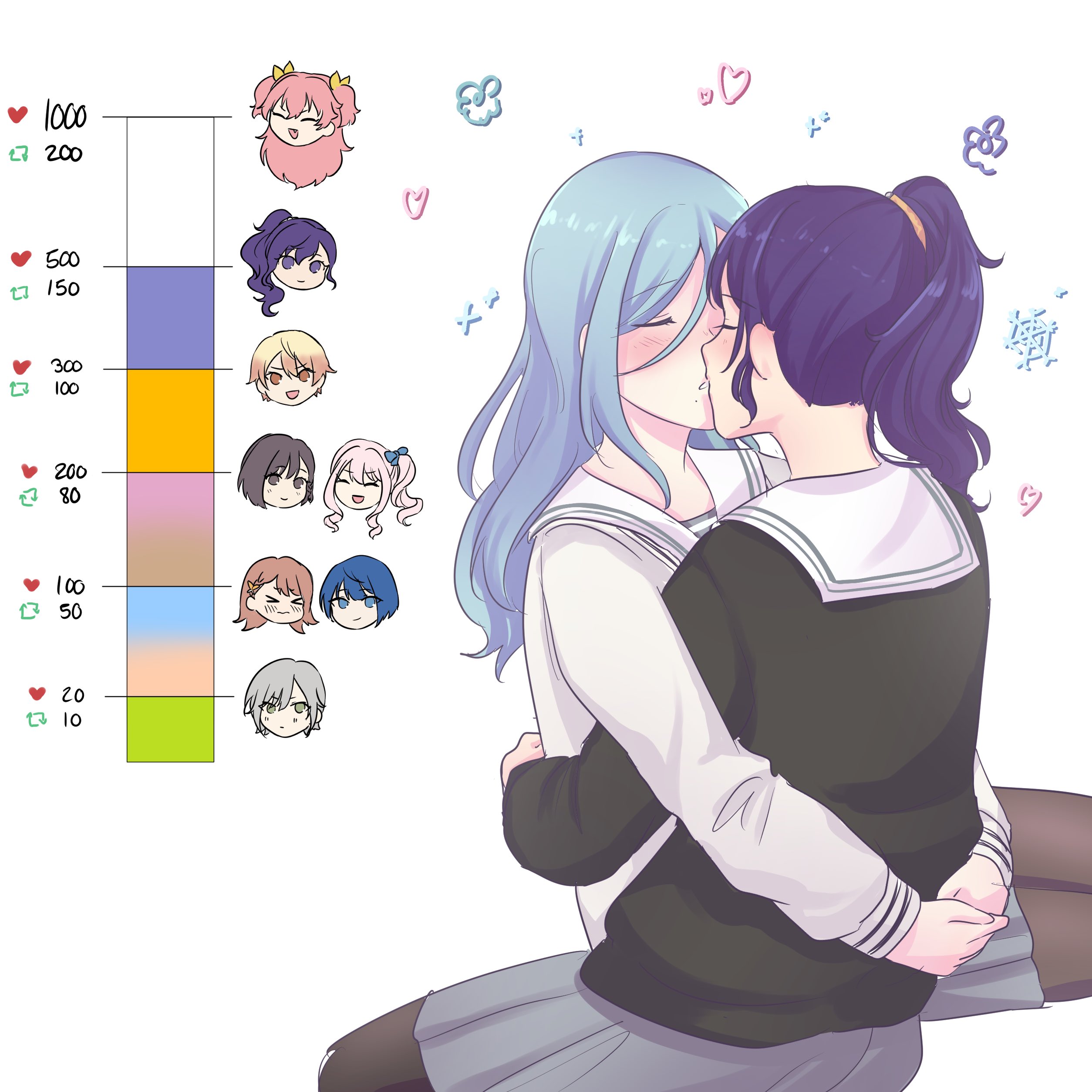 1boy1other6+girlsarms around waistblack shirtblonde hairblue eyesblue hairblushbrown eyesbrown hairclosed eyesclosed mouthfanggradient hairgreen eyesgrey hairgrey skirthearthugkisskiss meter (meme)long hairmememolemole under mouthmulticolored hairmultiple girlsopen mouthorange hairpink hairpleated skirtponytailpurple eyespurple hairschool uniformserafukushirtshizusawasshort hairside ponytailsimple backgroundsittingskirtsmiletwo side upwhite backgroundwhite shirtyuri