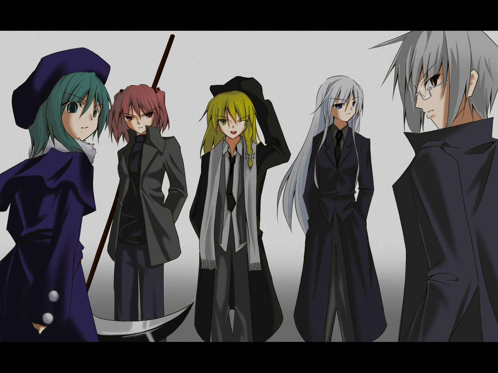 :d1boy4girlsalternate costumeblonde hairformal clothesfrom behindgrey backgroundgrey eyesletterboxedlong hairlong sleeveslooking at viewerlooking backmultiple girlsone eye closedopen mouthparodyparted lipsscythesimple backgroundsmilestandingsuitvery long hair
