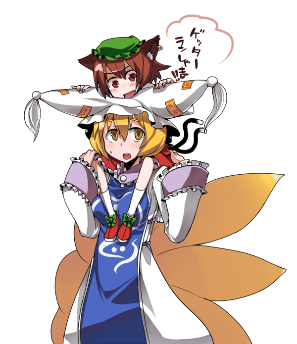 2girlsanimal earsanimal hatblonde hairbrown haircarryingcat earscat girlcat tailearringsfangfemale focusfox tailhatjewelrylong sleevesmob capmultiple girlsmultiple tailsno noseparodypiggybackshort hairshoulder carrysimple backgroundtailtasselwhite backgroundwide sleevesyellow eyes