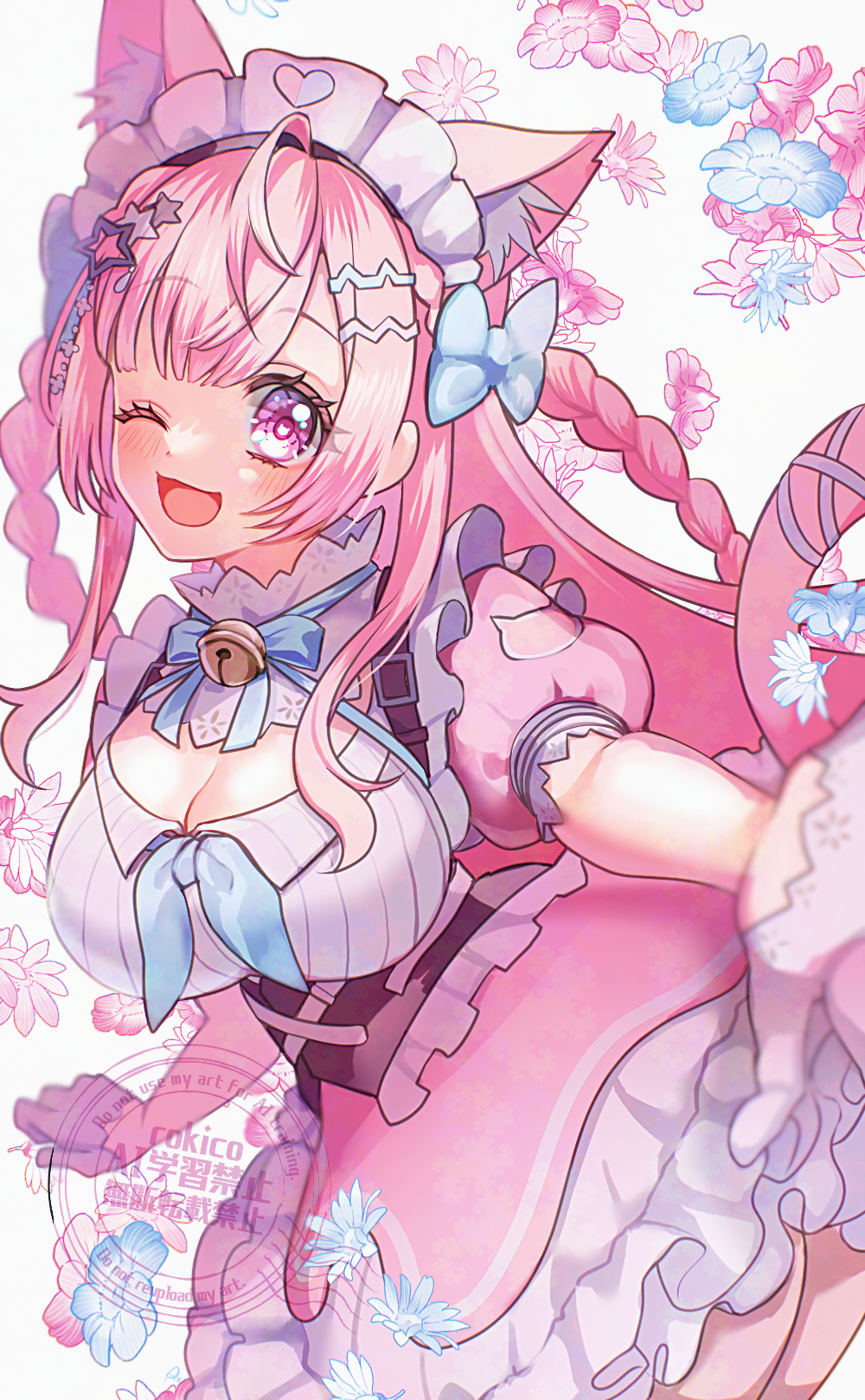 1girlahogeanimal earsbellblue bowblue flowerblue ribbonblushbowbreastscat earscat girlcat hair ornamentcat tailcleavagecleavage cutoutclothing cutoutdressextra earsfloral backgroundflowergloveshair bowhair ornamenthairclipheartheart printjingle belllarge breastslong hairlooking at viewermaidmaid headdressneck bellneck ribbonone eye closedopen mouthpink dresspink eyespink flowerpink hairpink tailribbonshort sleevessmilesolostar (symbol)star hair ornamentsuspenderstailtail ornamenttail ribbonthighstwo side upunderbustvirtual youtuberwatermarkwhite backgroundwhite dresswhite gloves
