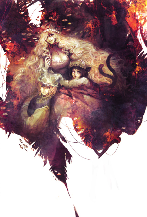 3girlsanimal earsanimal hatblonde hairbowbreastsbrown haircat earscat girlcleavageearringselbow glovesfemale focusgloveshair over one eyehands in opposite sleeveshathat bowhugjewelrylarge breastslong hairlong sleevesmob capmultiple girlsmultiple tailsshort hairshort sleevessmiletailtasselwavy hairwhite backgroundwide sleeves
