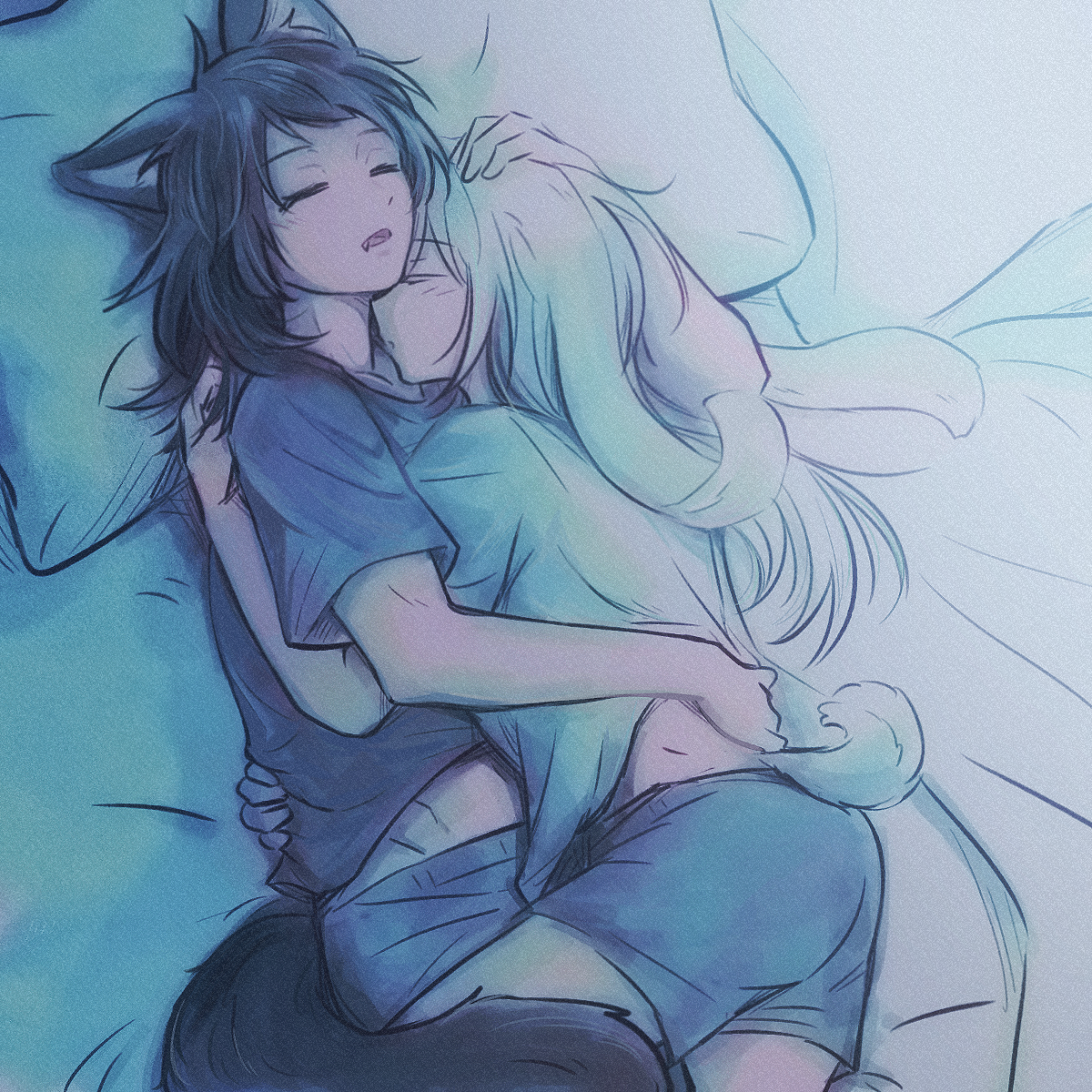 2girlsanimal earsblack hairblack shirtblue shortsblushclosed eyescuddlingfanggreen shirtholding own armhugkemonomimi modelong hairmultiple girlsopen mouthpillowrabbit earsrabbit girlrabbit tailshirtshortstailwolf earswolf girlwolf tailyuri