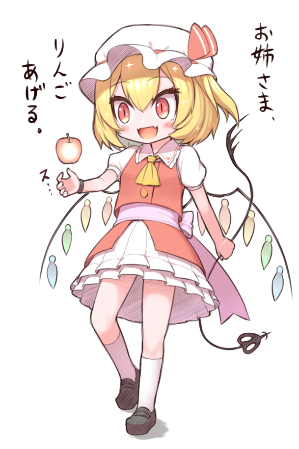 :d1girlappleascotblack shoesblonde hairblushcollared shirtcrystal wingsfangfangsfoodfrilled skirtfrillsfruitfull bodygameplay mechanicshatlaevatein (touhou)loafersmob capmulticolored wingsopen mouthorange eyespuffy short sleevespuffy sleevespurple sashred vestsashshirtshoesshort hairshort sleevessimple backgroundskin fangskin fangsskirtsmilesockssolovestwhite backgroundwhite shirtwhite skirtwhite sockswingsyellow ascot