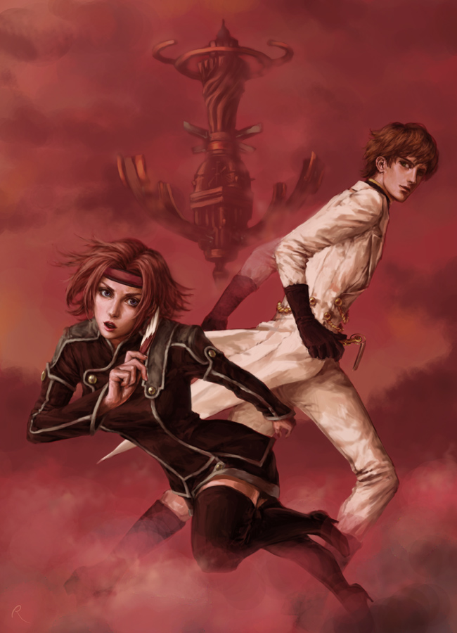 shimabara, sio vanilla, anna irving, kratos aurion, lloyd irving, tales of (series), tales of symphonia, bad id, bad pixiv id, 00s, 2boys, brown hair, flower, grave, male focus, multiple boys, red eyes, red shirt, shirt, sword, tombstone, weapon
