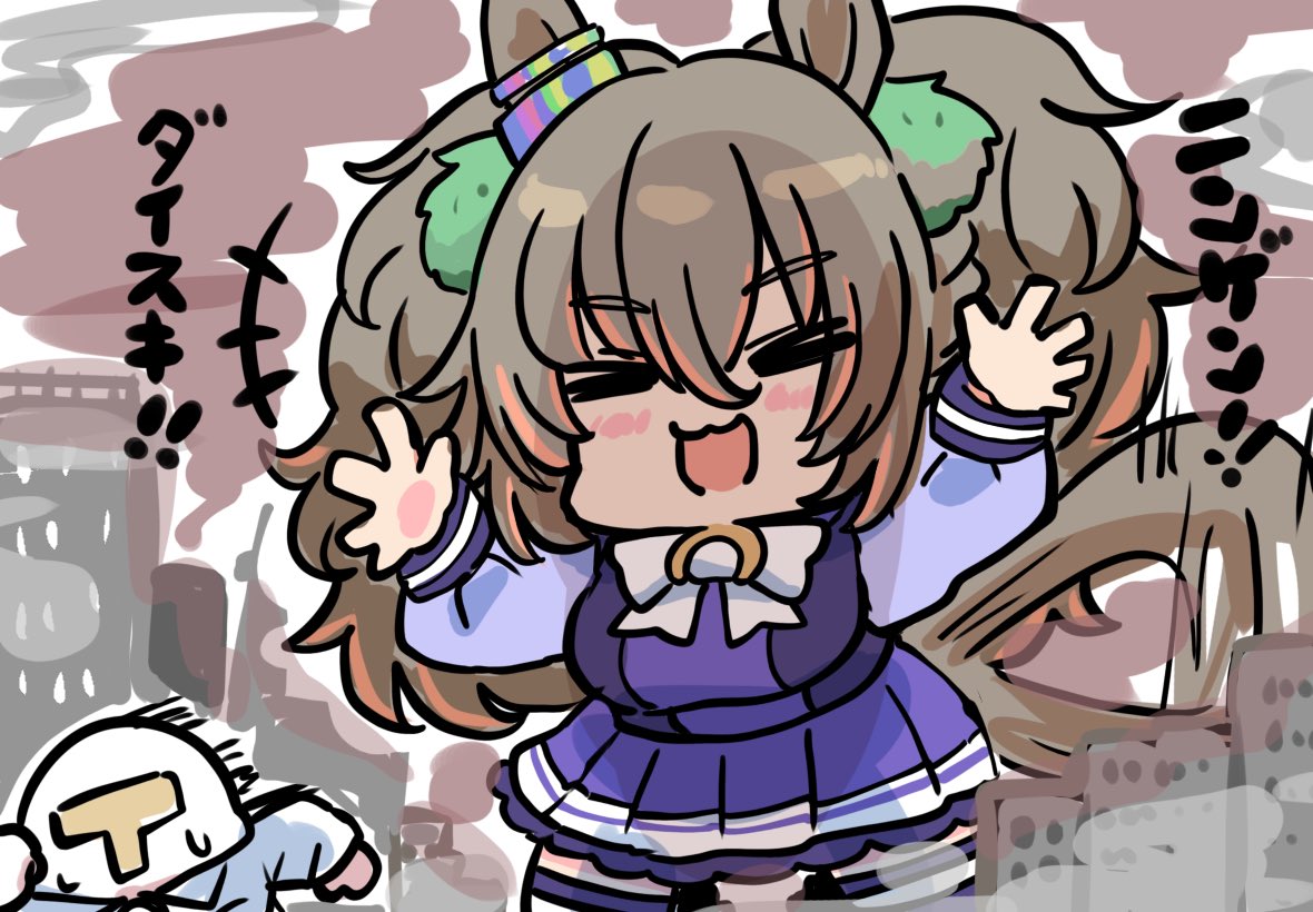 :d1boy1girl1otherafterimageanimal earsblushbowbreastsbrown hairbuildingclosed eyesgiantgiantesshair between eyeshorse earshorse girlhorse taillarge breastslong hairopen mouthpleated skirtpurple shirtpurple skirtpurple thighhighsschool uniformshirtskirtsmilestandingtailthighhighstracen school uniformtwintailsvery long hairwhite bow
