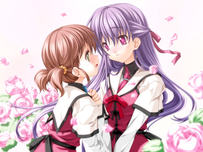 2girlsblushbrown haireye contactflowergreen eyeshair ribbonholding handsimminent kisslong hairlooking at anothermultiple girlsnecktieopen mouthpetalspink eyespink hairpurple hairribbonroserose petalsschool uniformshort hairshort twintailstwintailsvery long hairyuri