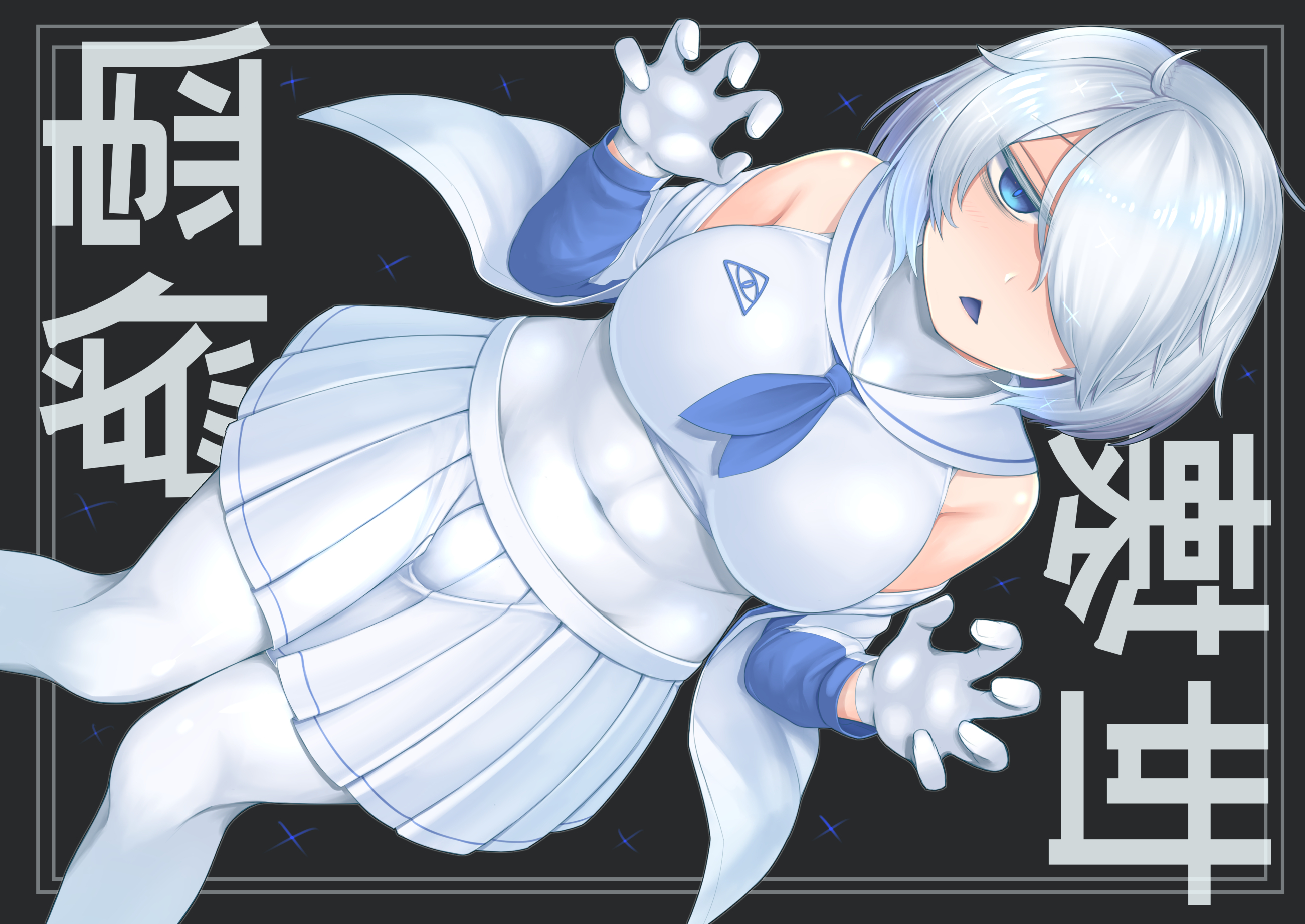 1girlblue eyesblue neckerchiefblushbreastsclaw posecovered naveldutch anglefeet out of frameglovesgrey backgroundhair between eyeshair over one eyelarge breastslong bangslooking at viewerneckerchiefopen mouthpleated skirtsailor collarshirtshort hairskirtsleevelesssleeveless shirtsolotriangle mouthwhite gloveswhite hairwhite sailor collarwhite shirtwhite skirt