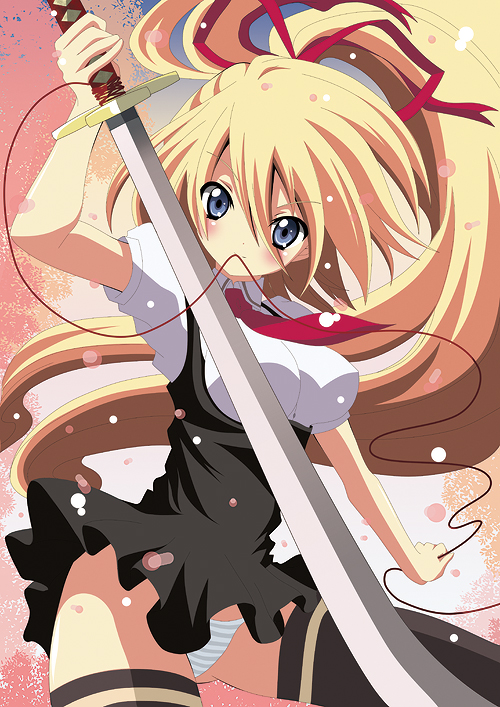 blonde hairblue eyeslong hairpantiesstriped clothesstriped pantiesswordthighhighsunderwearupskirtvery long hairweapon