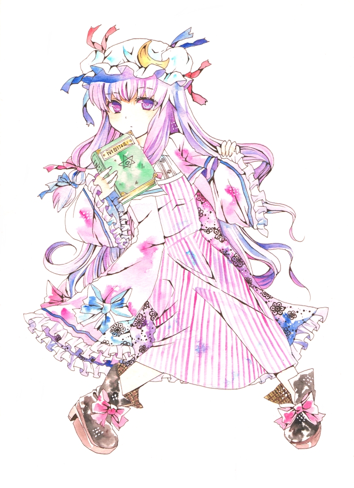 1girlbookcrescentcrescent hat ornamentfemale focushathat ornamentlong hairpurple eyespurple hairribbonsimple backgroundsolowhite background