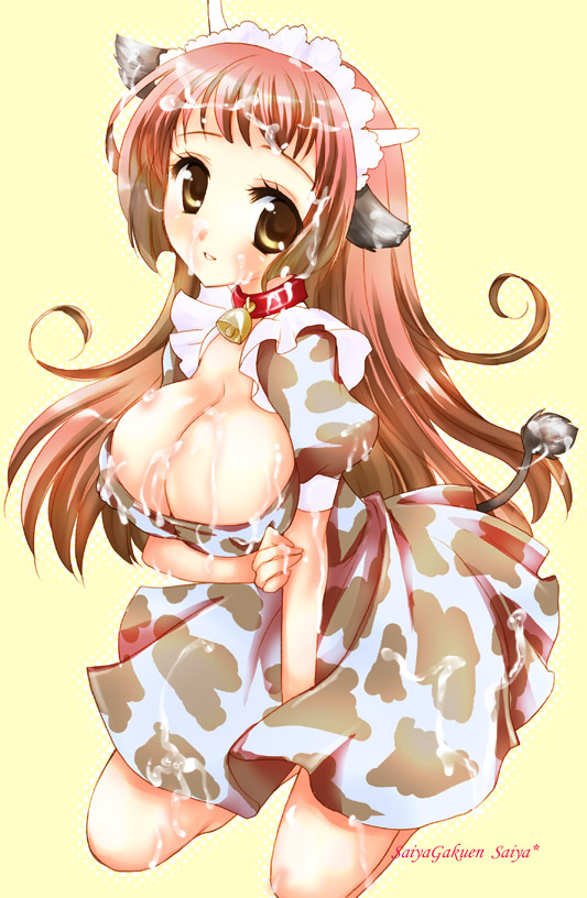 1girlanimal earsanimal printbellblushbreastsbrown eyesbrown hairbukkakecleavagecollarcow printcumfemale focushornshuge breastskneelinglong hairmaidneck bellsolotail