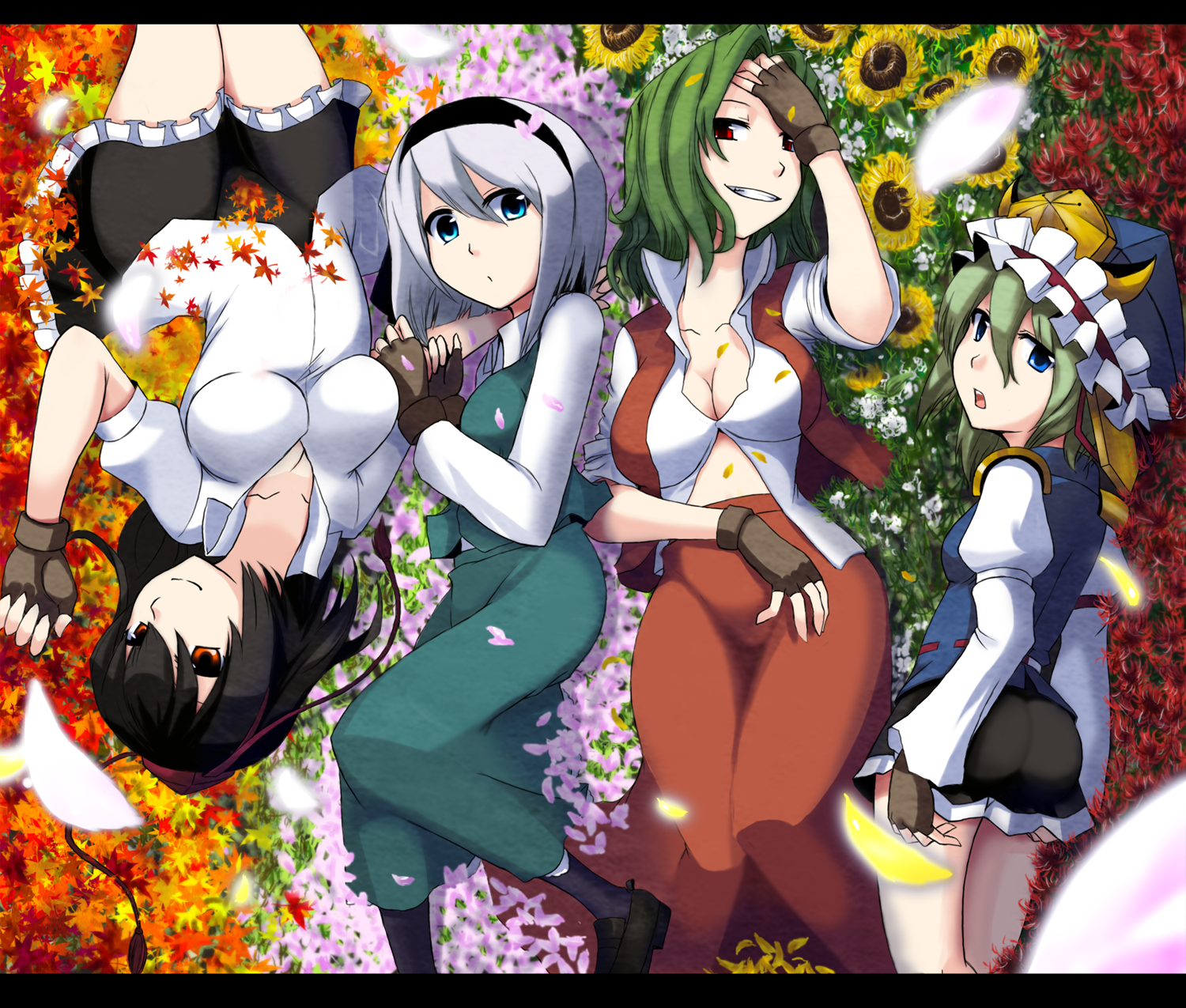 :o4girlsadjusting hairautumn leavesbreastscherry blossomscleavagefemale focusfingerless glovesflowerfrom aboveglovesgrinhairbandhatlarge breastsleafletterboxedlooking at viewerlyingmaple leafmultiple girlspetalsred flowerseductive smilesmilespider lilysunflowertokin hatupside-downvest