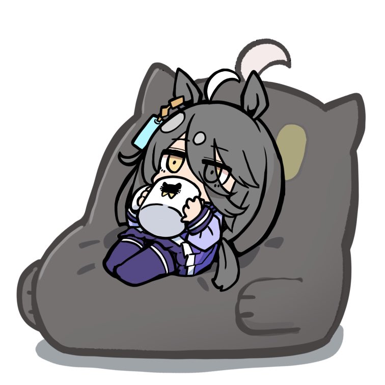 1girlahogeanimal earsblack hairchibicupfull bodyhair over one eyeholdingholding cuphorse earshorse girlhorse taillong sleevesmugmulticolored hairpleated skirtpuffy long sleevespuffy sleevespurple shirtpurple skirtpurple thighhighsschool uniformshadowshirtsimple backgroundskirtsolotailthighhighstracen school uniformtwo-tone hairwhite backgroundwhite hairyellow eyes