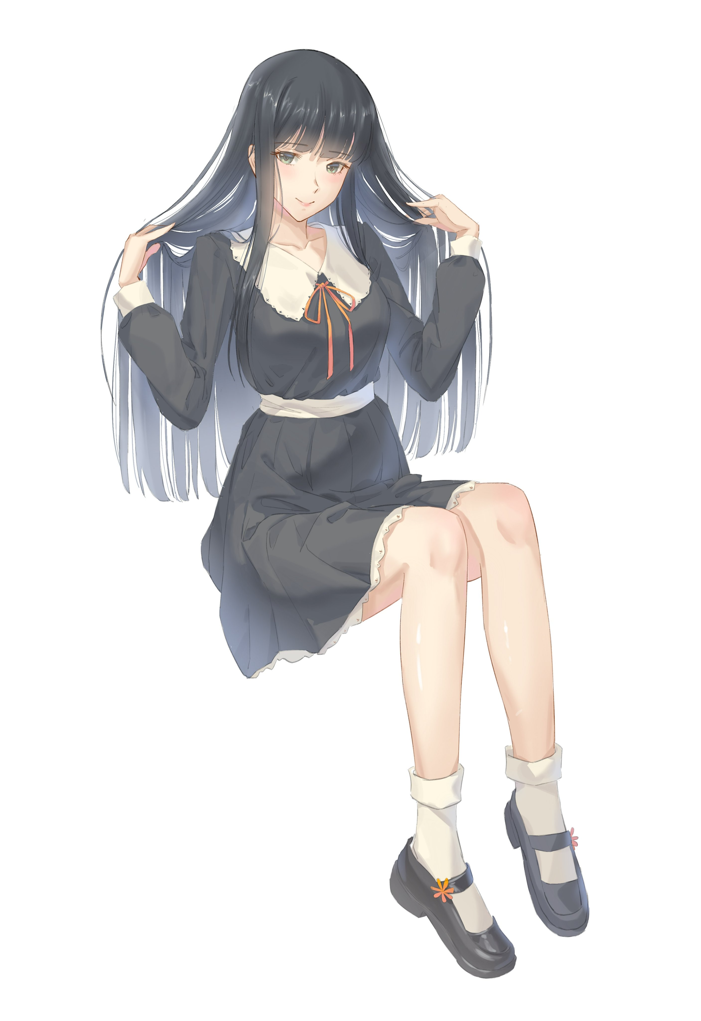 1girlblack dressblack hairblack shoescollarbonedressfull bodygreen eyesholdingholding own hairlong hairlong sleeveslooking at viewermary janesneck ribbonorange ribbonpleated skirtribbonschool uniformshoesshort dresssittingskirtsmilesockssolowhite socks