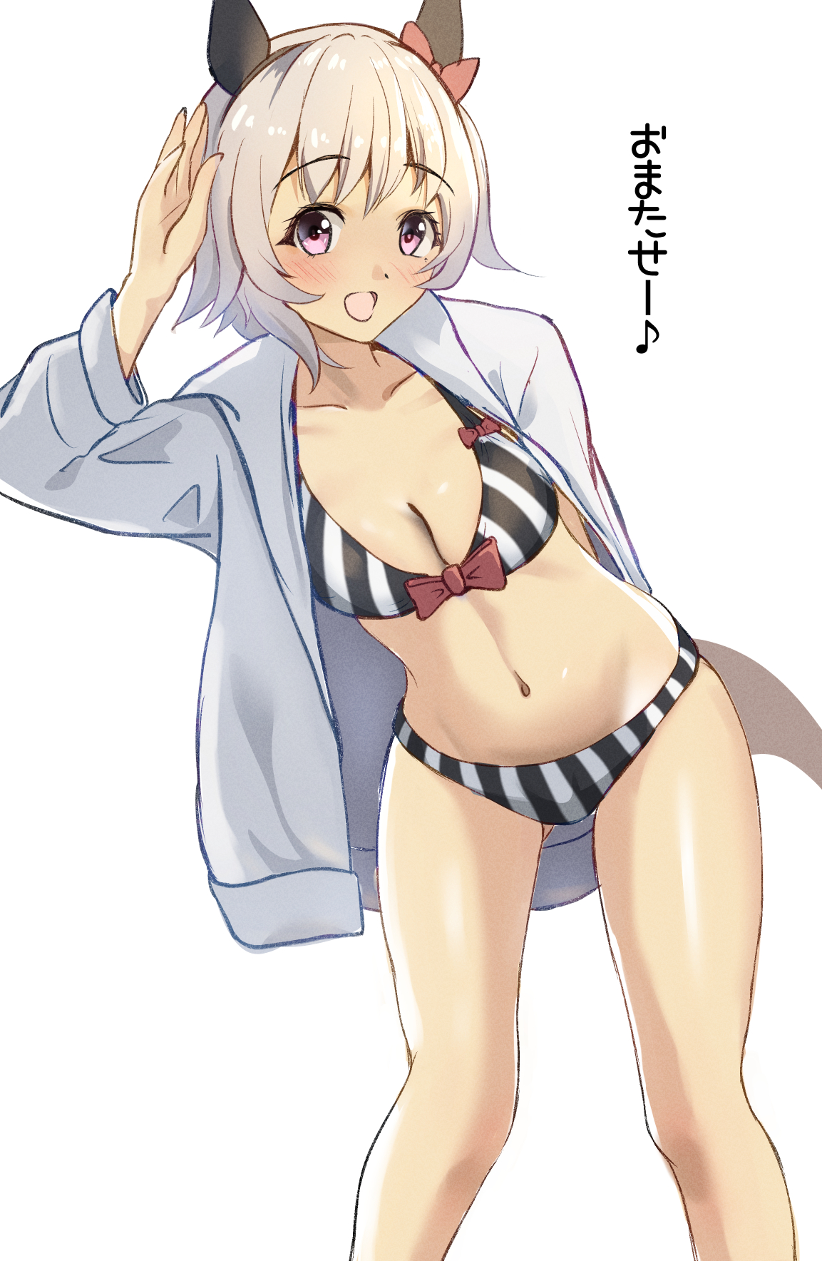 1girlanimal earsbikiniblack bikiniblack hairbandblushbowbreastscleavagecollarboneear bowear coversgrey hairhair between eyeshairbandhorse earshorse girlhorse tailjacketlong sleeveslooking at viewermedium breastsnavelopen clothesopen jacketopen mouthpurple eyesred bowshort hairsimple backgroundsmilesolostomachswimsuittailwhite backgroundwhite bikiniwhite jacket