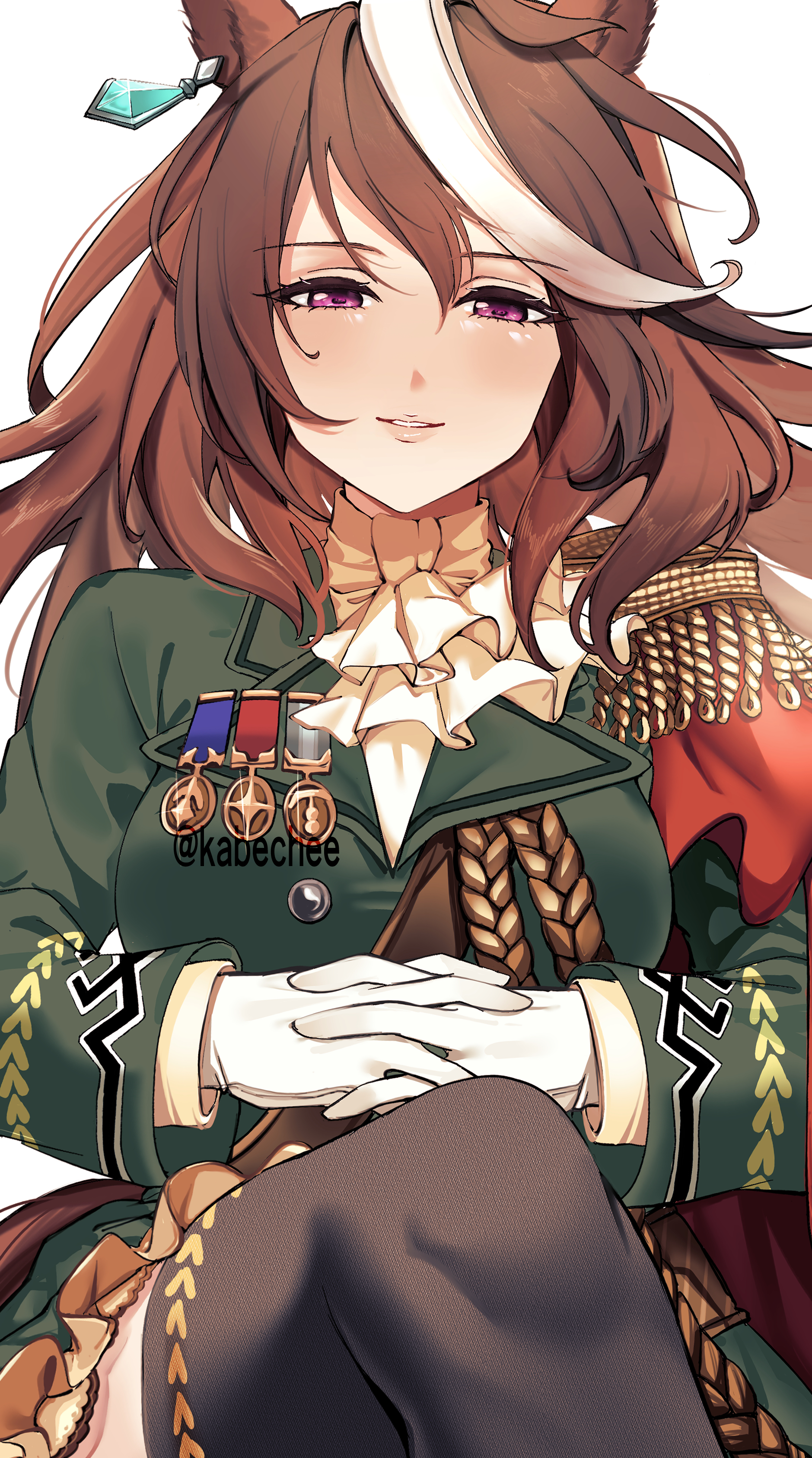 1girlaiguilletteanimal earsascotblack thighhighsblushbreastsbrown hairbuttonscapedouble-breastedear ornamentearringsepaulettesglovesgreen jackethair between eyeshorse earshorse girlhorse tailjacketjewelrylong hairlong sleeveslooking at viewermedalmedium breastsmulticolored hairparted lipspurple eyesred capeside capesingle earringsingle epaulettesmilestreaked hairtailthighhighswhite ascotwhite gloveswhite hair