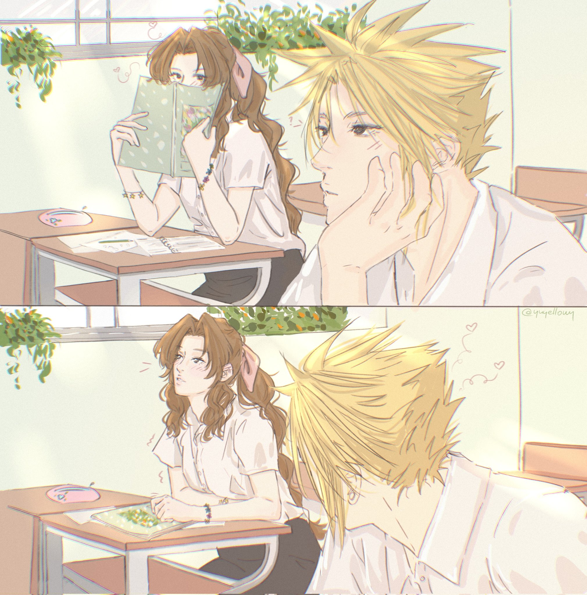 1boy1girlalternate costumeblack skirtblonde hairbraceletbrown hairclassroomcollared shirtdeskflower bracelethair between eyeshair ribbonhead on handjewelrylight blushlong hairlooking at anotherparted bangsparted lipspink ribbonponytailribbonschool deskschool uniformshirtshort hairshort sleevessidelocksskirtstar bracelettwitter usernamewhite shirtyuyellowy