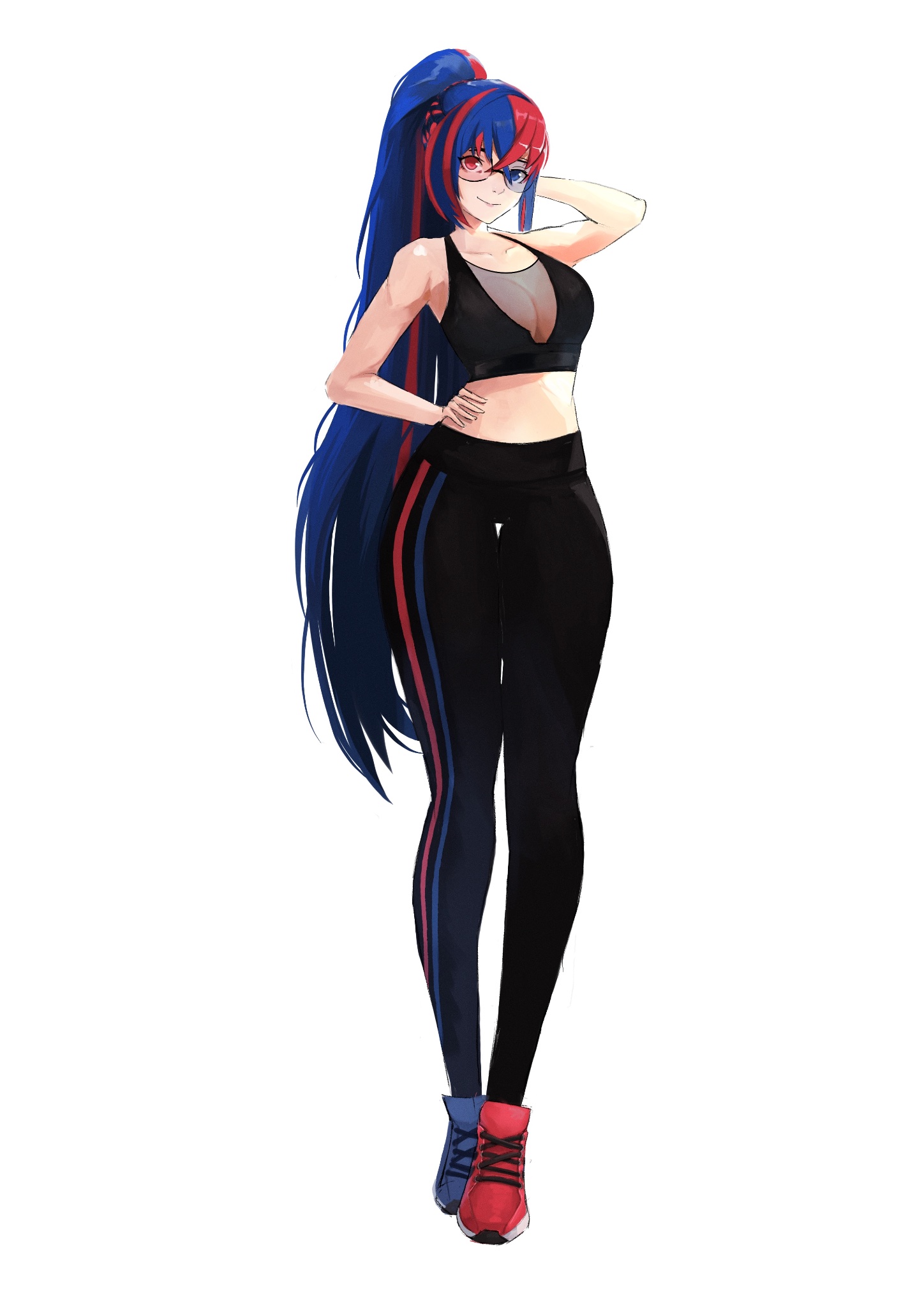 1girlalternate costumeasymmetrical footwearbare shouldersblack leggingsblack sports brablue eyesblue hairbreastscleavageclosed mouthcollarbonecrossed bangsfull bodyglasseshair between eyesheterochromialarge breastsleggingslong hairlooking at viewermidriffmismatched footwearmulticolored hairponytailred eyesred hairsee-through clothessimple backgroundsmilesolosplit-color hairsports bratwo-tone hairvery long hairwhite backgroundworkout clothes