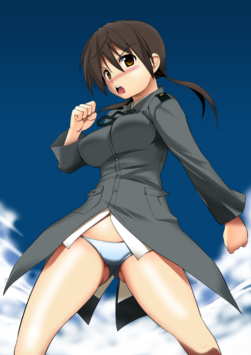 00s1girlangryblushbrown eyesbrown haircloudfemale focusmilitarymilitary uniformopen mouthpantiesshort hairskysolounderwearwhite panties