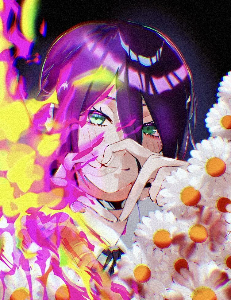 1girlblack chokerblack ribbonchokerclosed mouthexplosionflowergreen eyeshair between eyesheartheart handsmimimatugeneck ribbonpurple hairribbonshirtsolowhite flowerwhite shirt