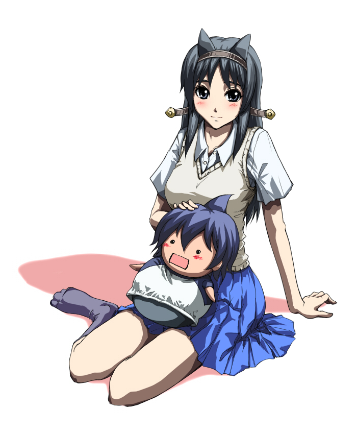 hiro (pixiv32951), rururara, nagi, kannagi, looking away, bad id, bad pixiv id, 00s, 1girl, :d, blue hair, blunt bangs, boots, female focus, hair ornament, hair tubes, hairband, long hair, miniskirt, open mouth, outstretched arm, pleated skirt, red eyes, skirt, smile, solo, squatting, tank top, wand, white skirt