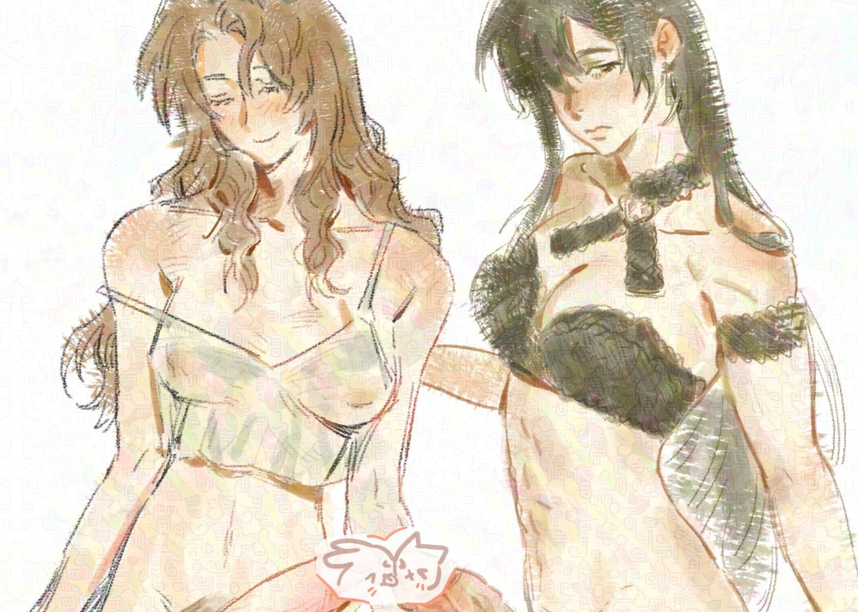 2girlsalternate costumearmletbare shouldersblack brablack hairblushbrabreastsbrown haircamisolecatcleavageclosed eyescovered erect nipplescrop topcross tieearringshair over one eyejewelrylong hairmedium breastsmidriffmultiple girlsparted bangsrabbitred eyessidelockssketchsmilestraight hairstrap slipunderwearupper bodywavy hairwhite backgroundwhite camisoleyuri