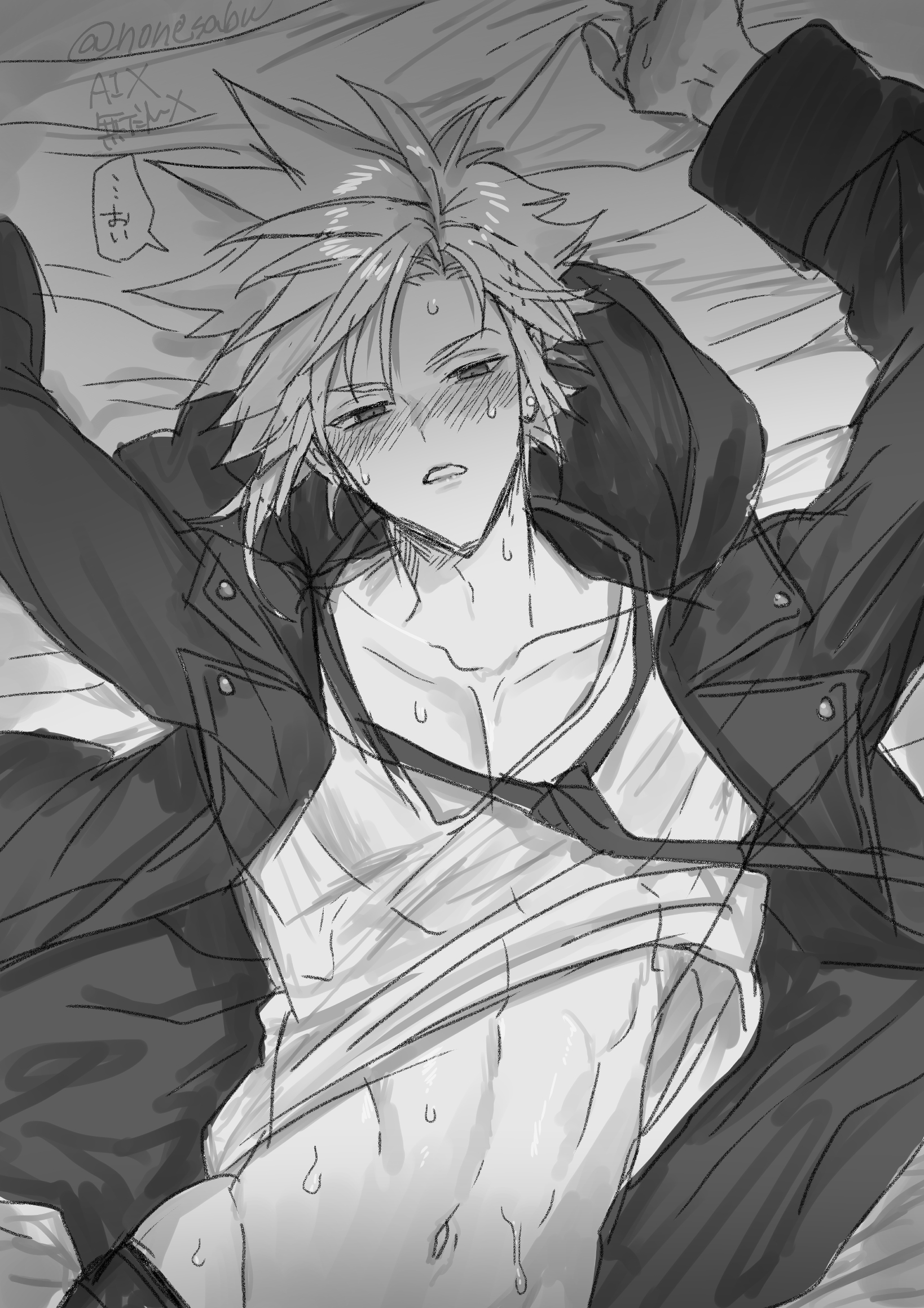 1boyarms behind headblack jacketblack pantsblushclothes liftdissidia duellum final fantasyearringshoodhood downhooded jacketjacketjewelrylong sleevesloose necktielyingmale focusmidriffnavelnecktieofficial alternate costumeon backon bedpantsparted lipsshirtshirt liftshort hairsingle earringsolospiked hairsweattwitter usernameupper bodywhite shirt