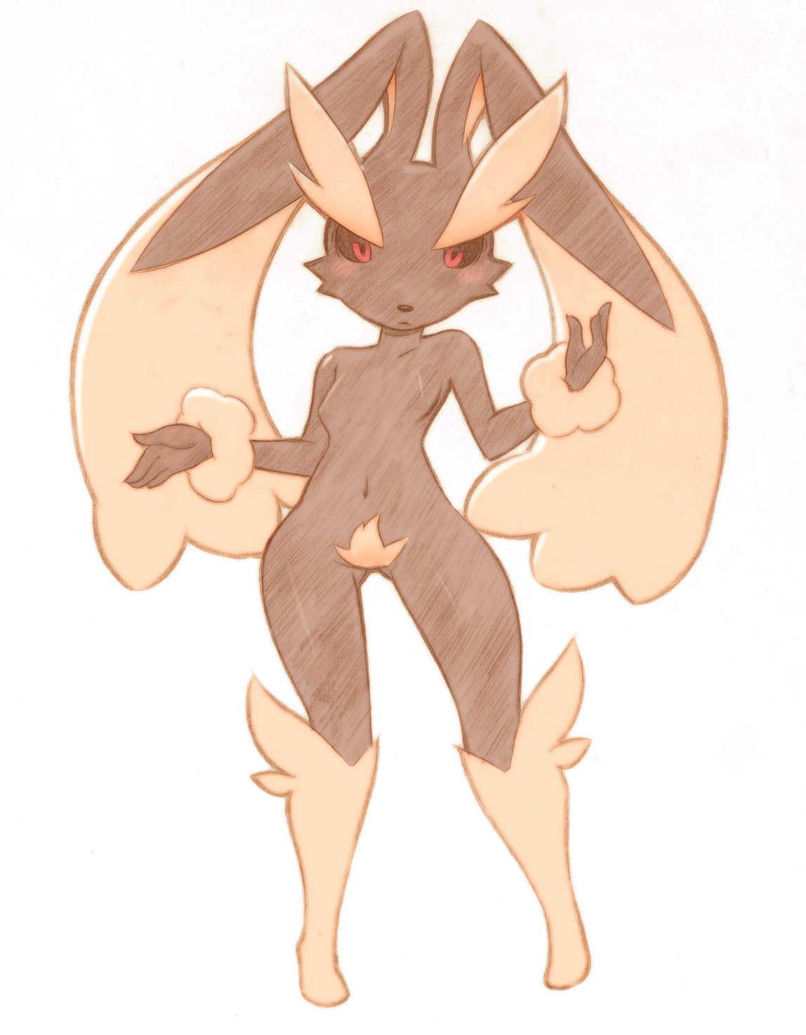 1girlanimal earsanimal nosebarefootbody furbreastsfemale focusfemale pubic hairflat chestfurryfurry femalegen 4 pokemonnudepersonificationpokemon (creature)pubic hairrabbitrabbit earsred eyesshruggingsimple backgroundsolothick eyebrowswhite background