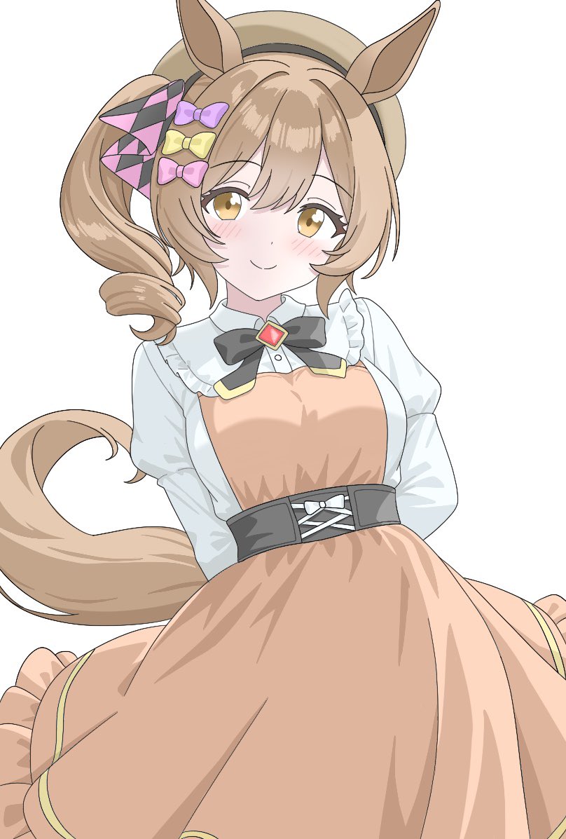 1girlanimal earsberetblack bowblack corsetblushbowbreastsbrown eyesbrown hairclosed mouthcorsetdressdrill hairdrill ponytailhair between eyeshair bowhair ornamenthathorse earshorse girlhorse taillong hairlong sleeveslooking at viewerorange dressside drillside ponytailsimple backgroundsmilesolotailwhite background