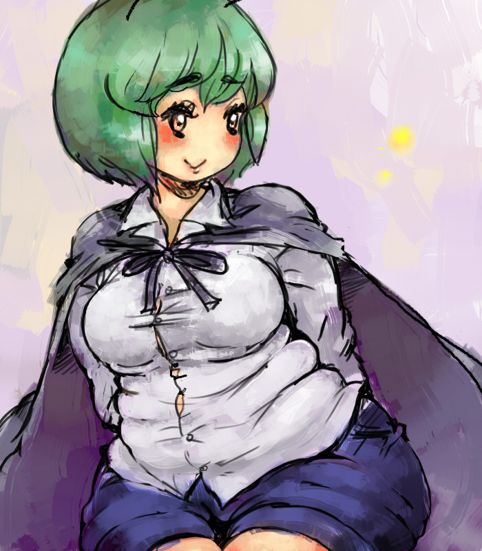 1girlalternate breast size (larger)antennaebreastscapecollared shirtfatfemale focusgradient backgroundgreen hairmedium breastsorange eyesplumpshirtsittingsolo