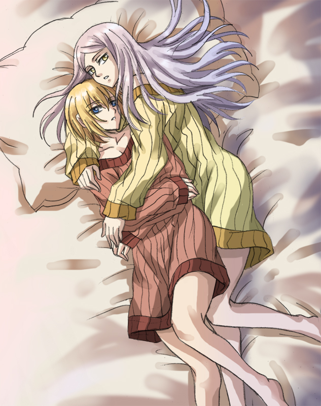 azuma masakadu, 2girls, gradient hair, green eyes, multicolored hair, multiple girls, red hair, skirt hold, thighhighs, twintails