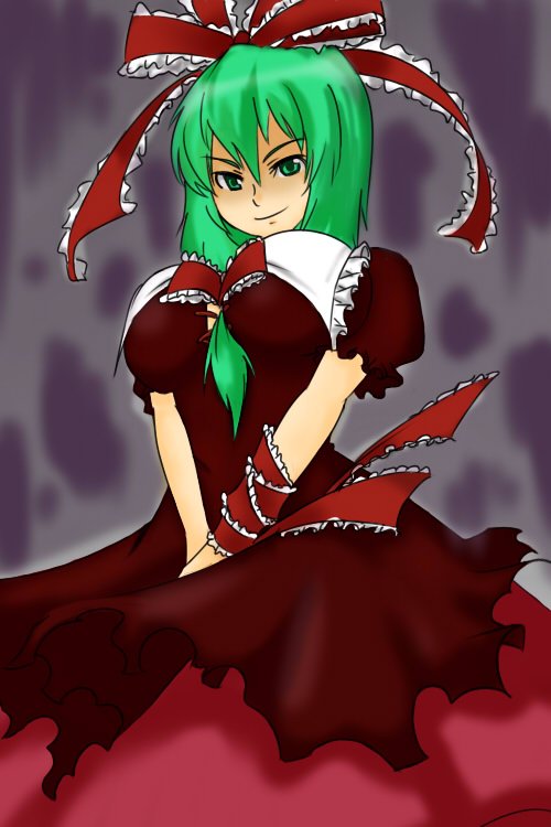 1girlbreastsfemale focusfront ponytailgreen eyesgreen hairhair ribbonmatching hair/eyesribbonsolo